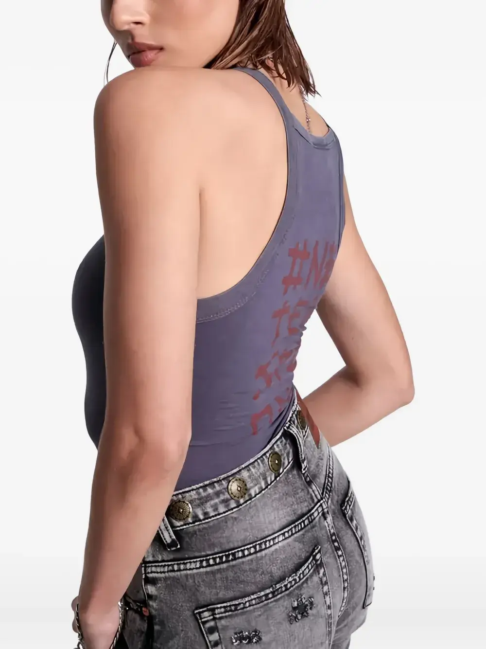 серый с принтом, графическая спинка, тонкие бретели, квадратный вырез