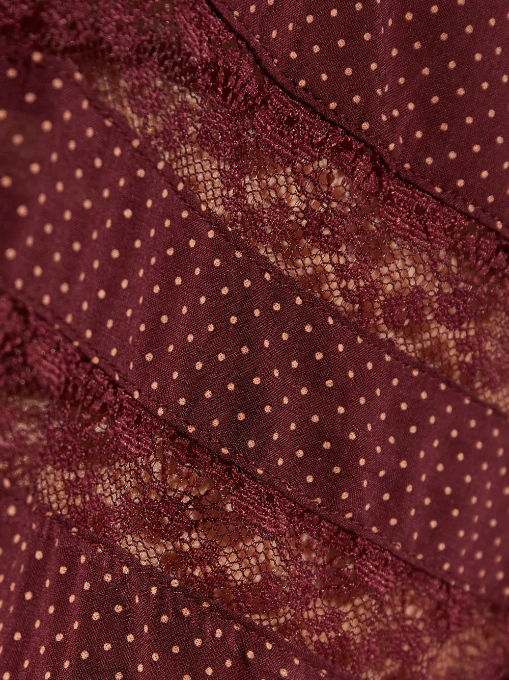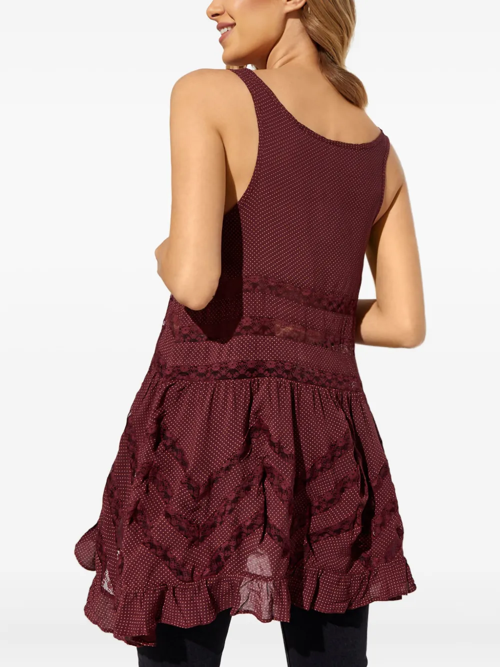 красное платье с кружевной отделкой, круглым вырезом, без рукавов, волнистым подолом и узором в горошек