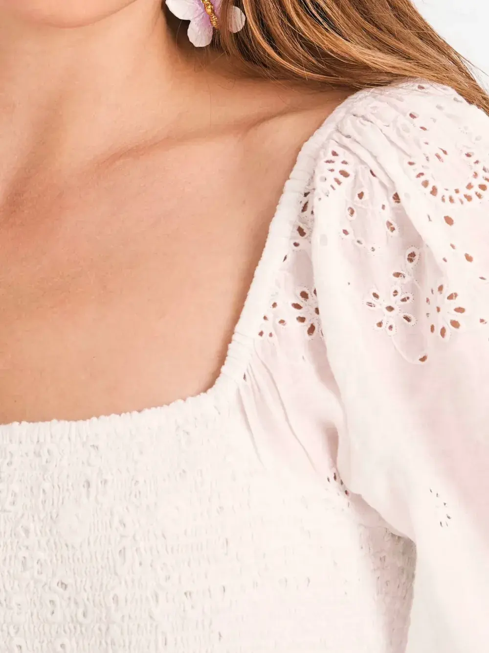 белый цвет, ажурный дизайн, рукава-фонарики, эластичные манжеты, квадратный вырез, сборка по низу