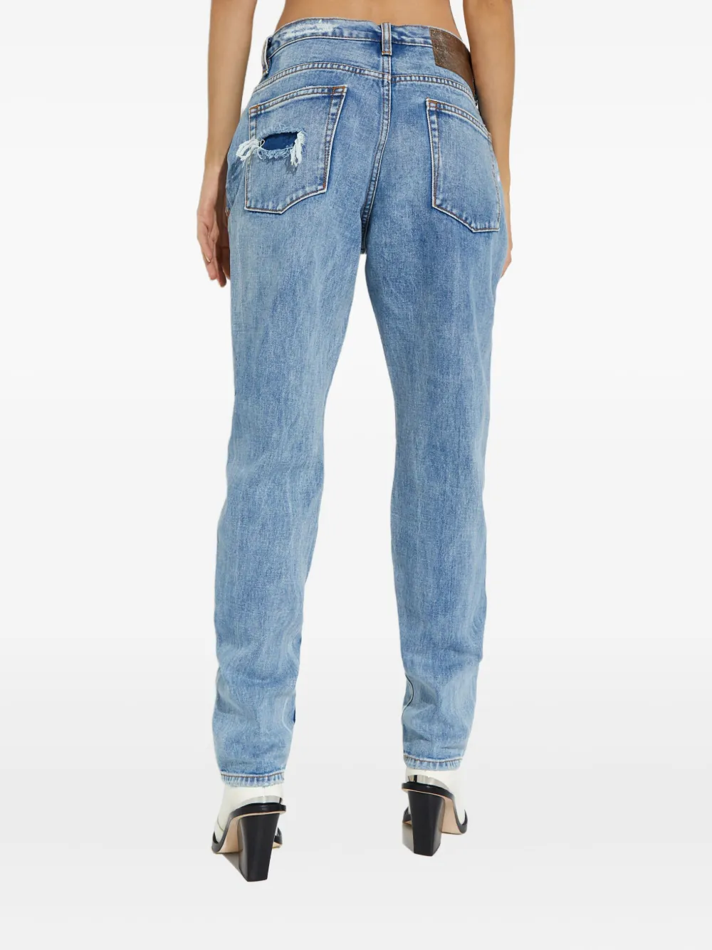 синий цвет, дизайн с пятью карманами, шлевки для ремня, потертости, застежка на молнию и пуговицу