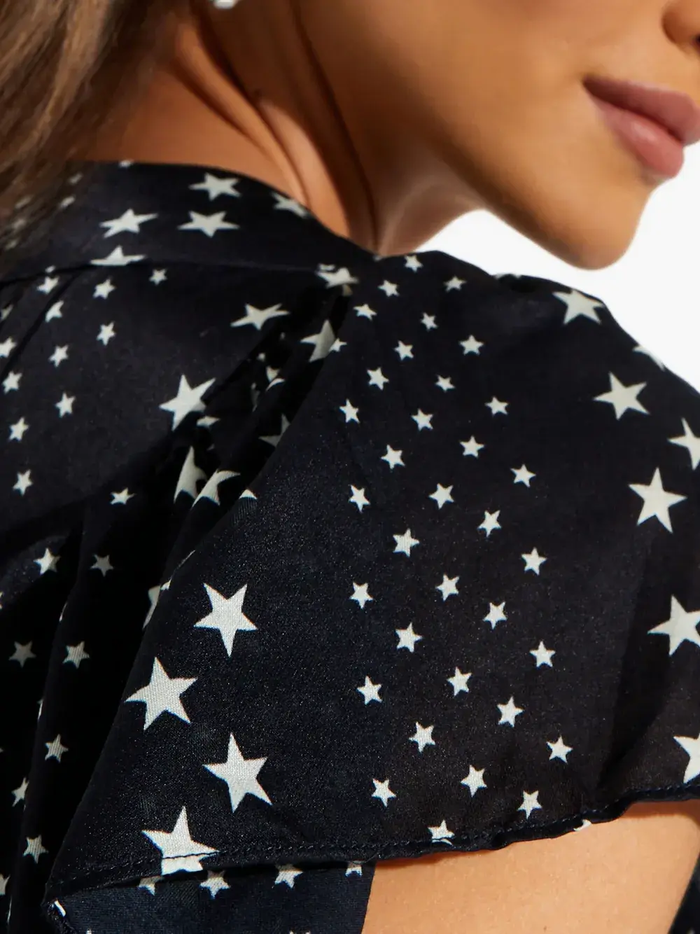 черное платье с принтом в виде звезд, V-образным вырезом, короткими рукавами, оборками и многоярусной юбкой
