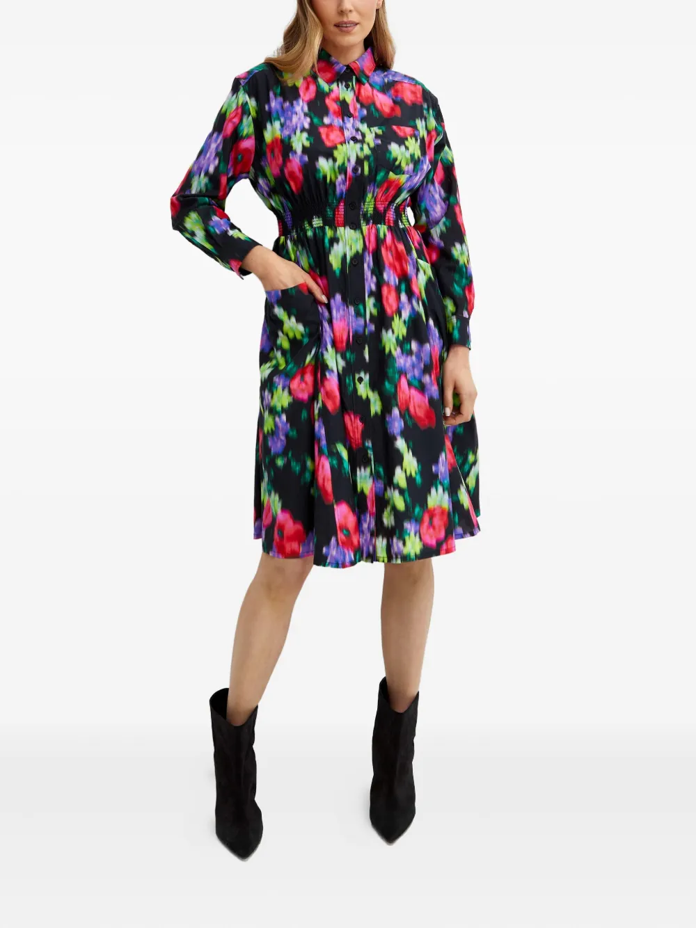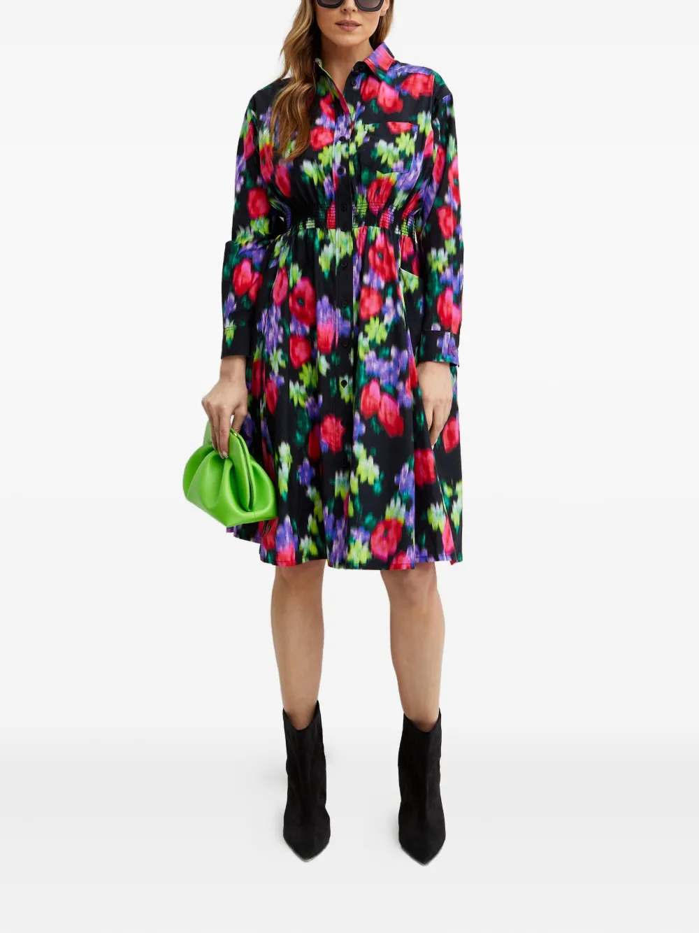 черный с цветочным принтом, застёжка на пуговицы, классический воротник, эластичная талия, длинные рукава, два накладных кармана