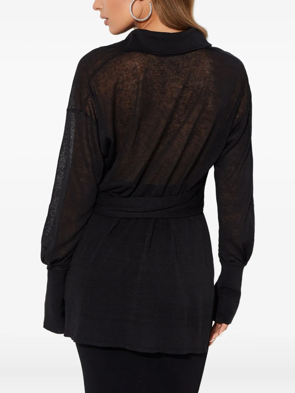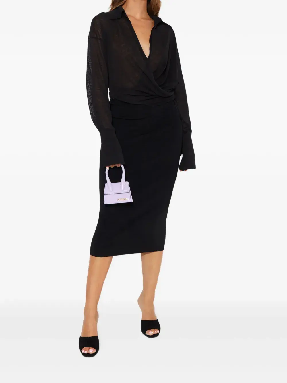 черный топ с длинными рукавами, драпировкой и запахом спереди