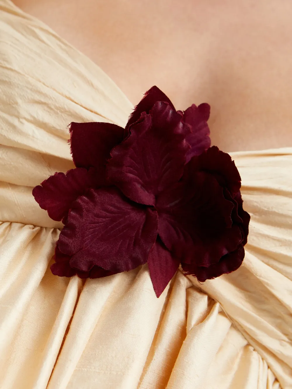бежевый шелк, оборки, длинные рукава, цветочный декор