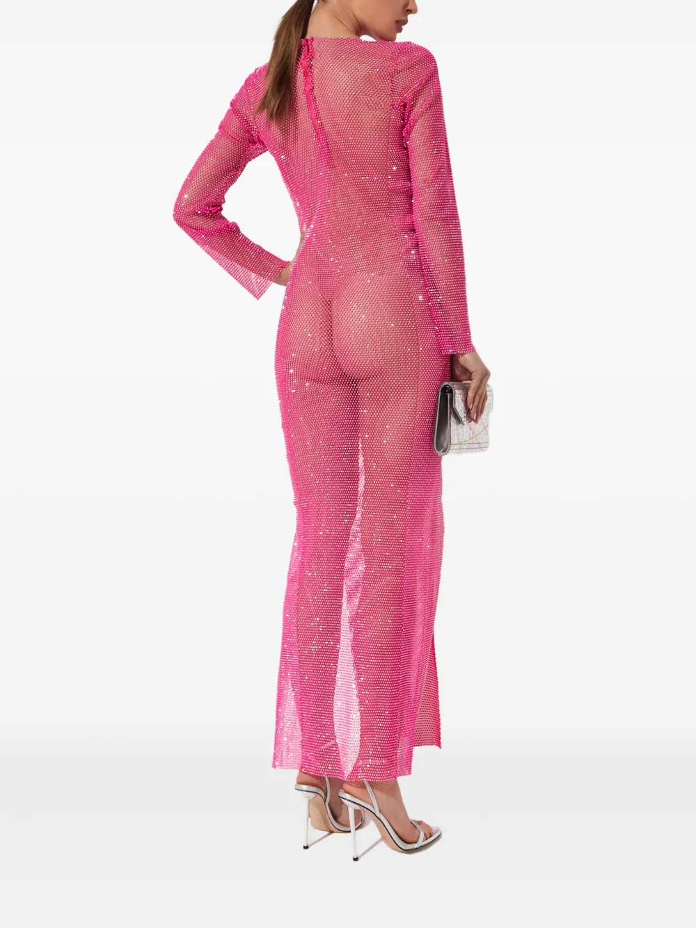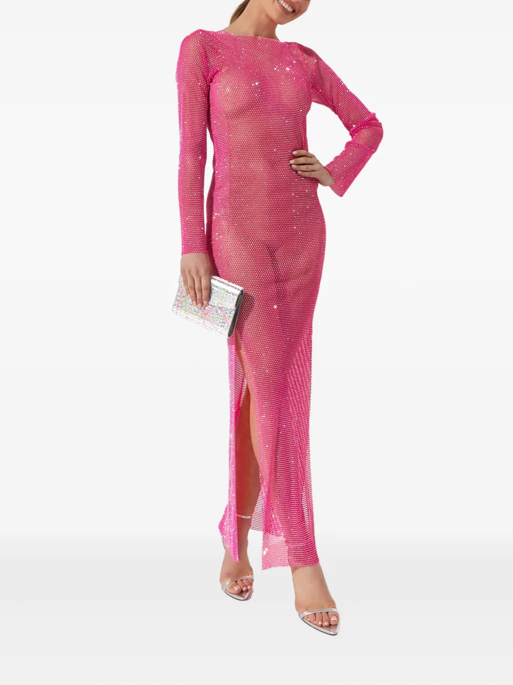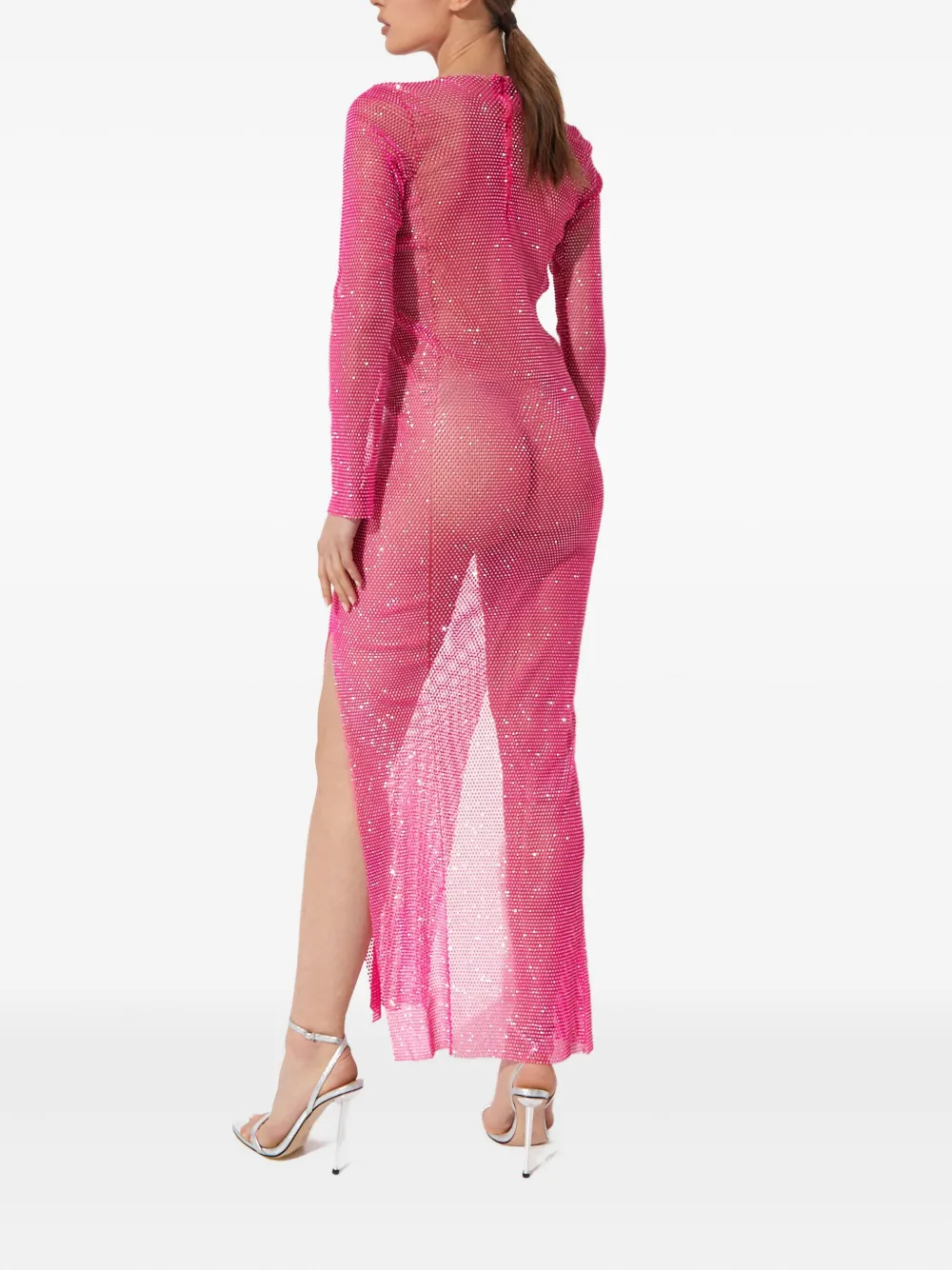 розовый дизайн из сетки, украшение кристаллами, круглый вырез, длинные рукава, скрытая застежка-молния сзади, полупрозрачная отделка, боковые разрезы