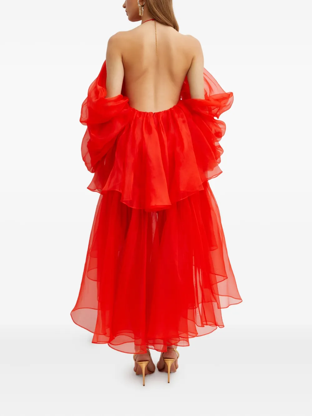 красное платье с оборками, V-образным вырезом, открытыми плечами, асимметричным подолом и открытой спиной