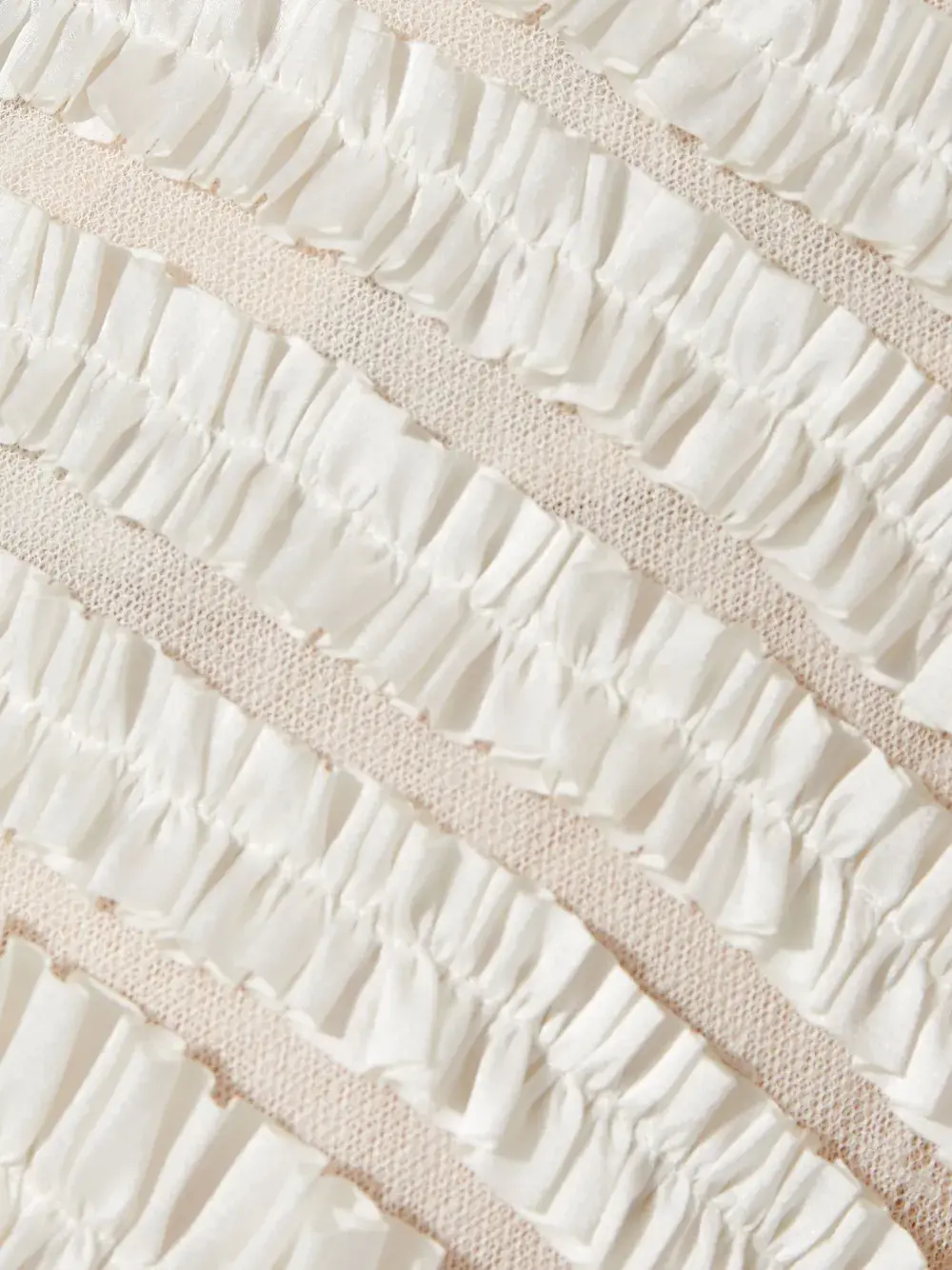 белый цвет, бандажный крой, отделка оборками, сетка из тюля, скрытая боковая застежка-молния, силуэт А-силуэта