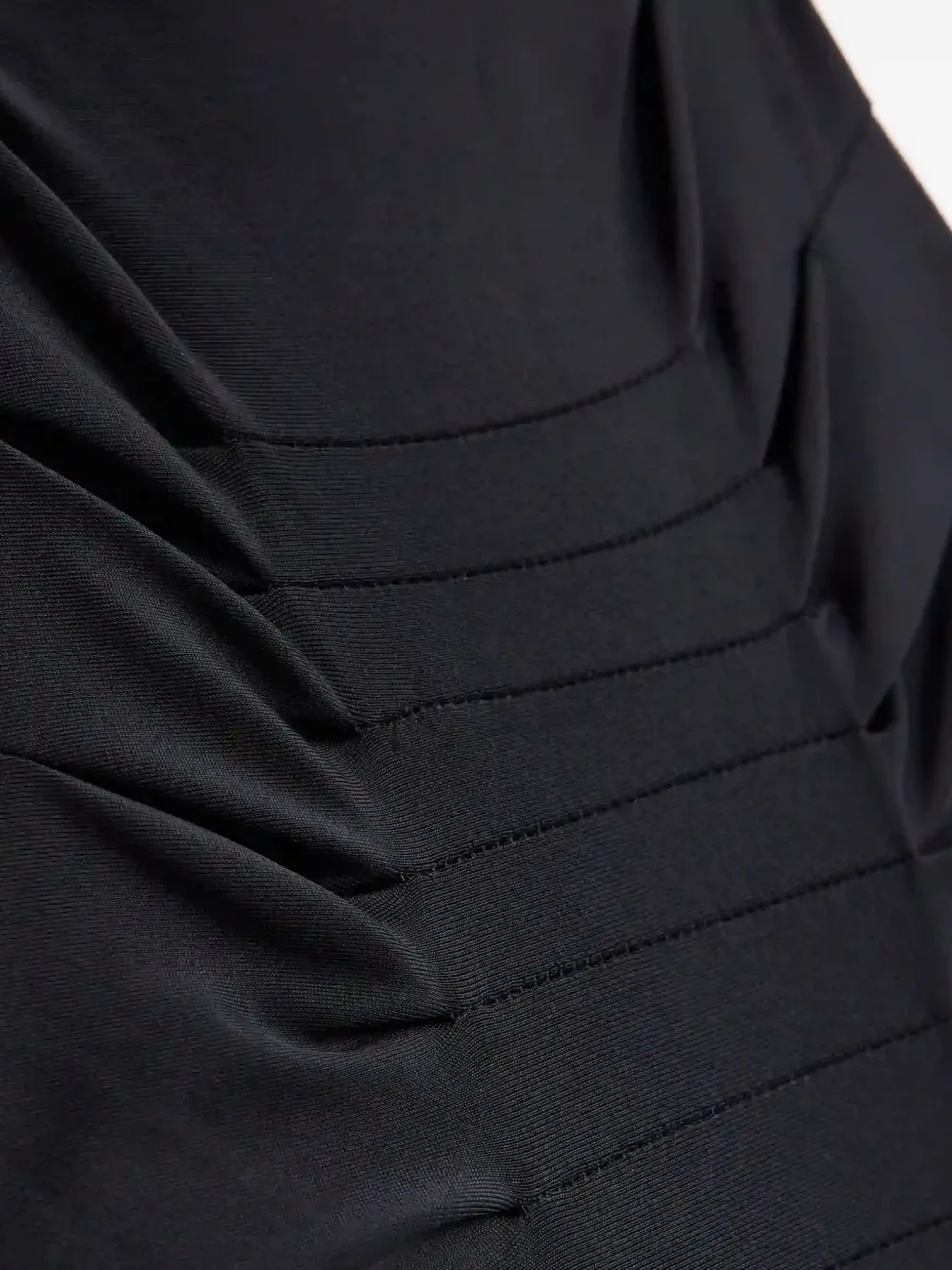 черное платье с американской проймой, круглым вырезом, присборенными деталями и скрытой застежкой-молнией
