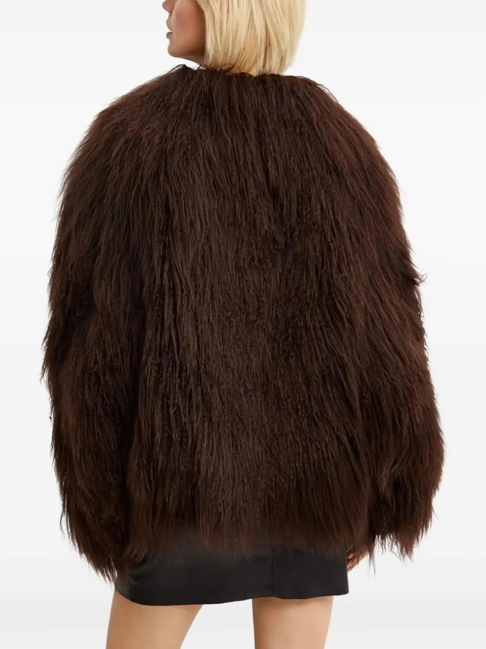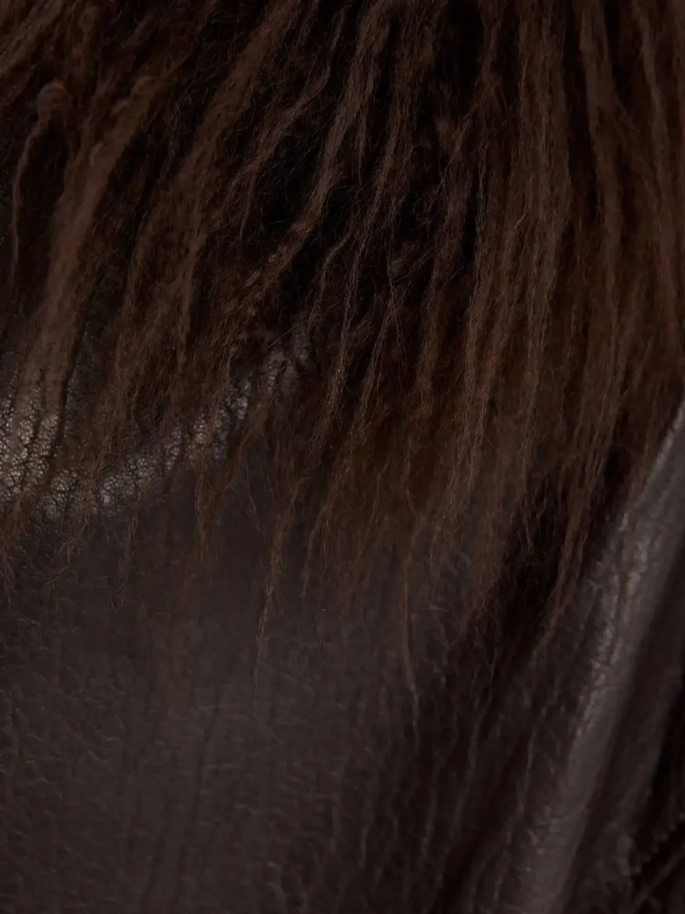 коричневая куртка с отделкой из овчины, застёжкой-молнией и двумя карманами на молнии
