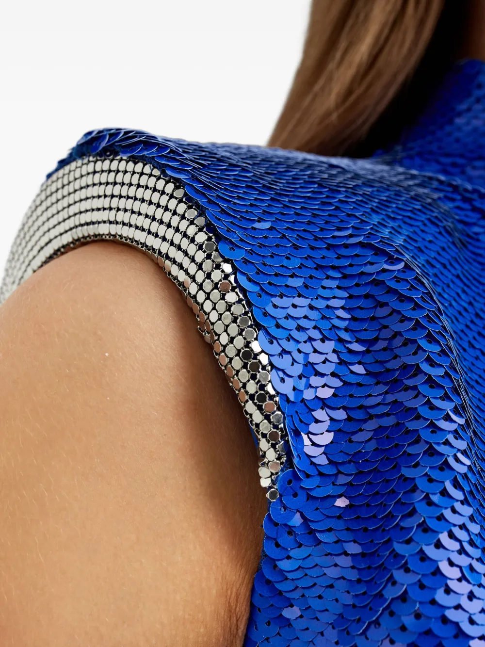 синее платье с отделкой из пайеток, стойкой, без рукавов, с подплечниками, металлическими сетчатыми вставками и потайной застежкой-молнией