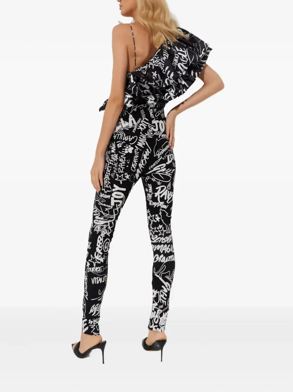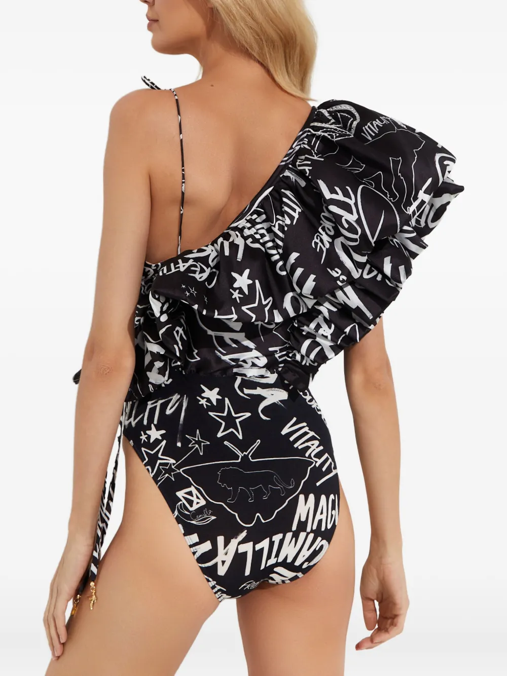 черный с графическим принтом, оборками, регулируемыми бретелями, завязками и декоративной подвеской