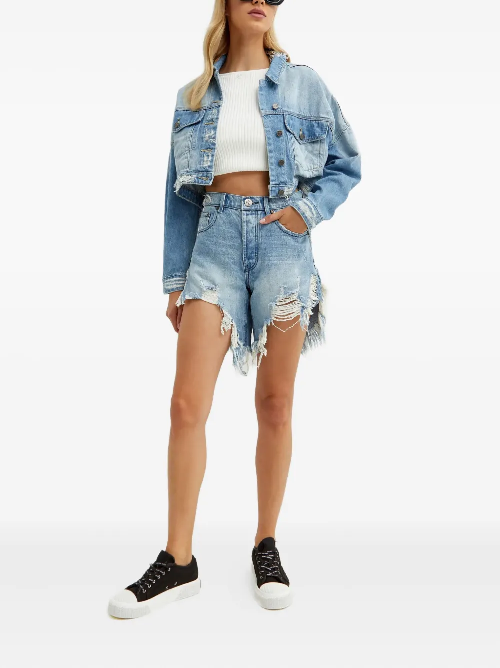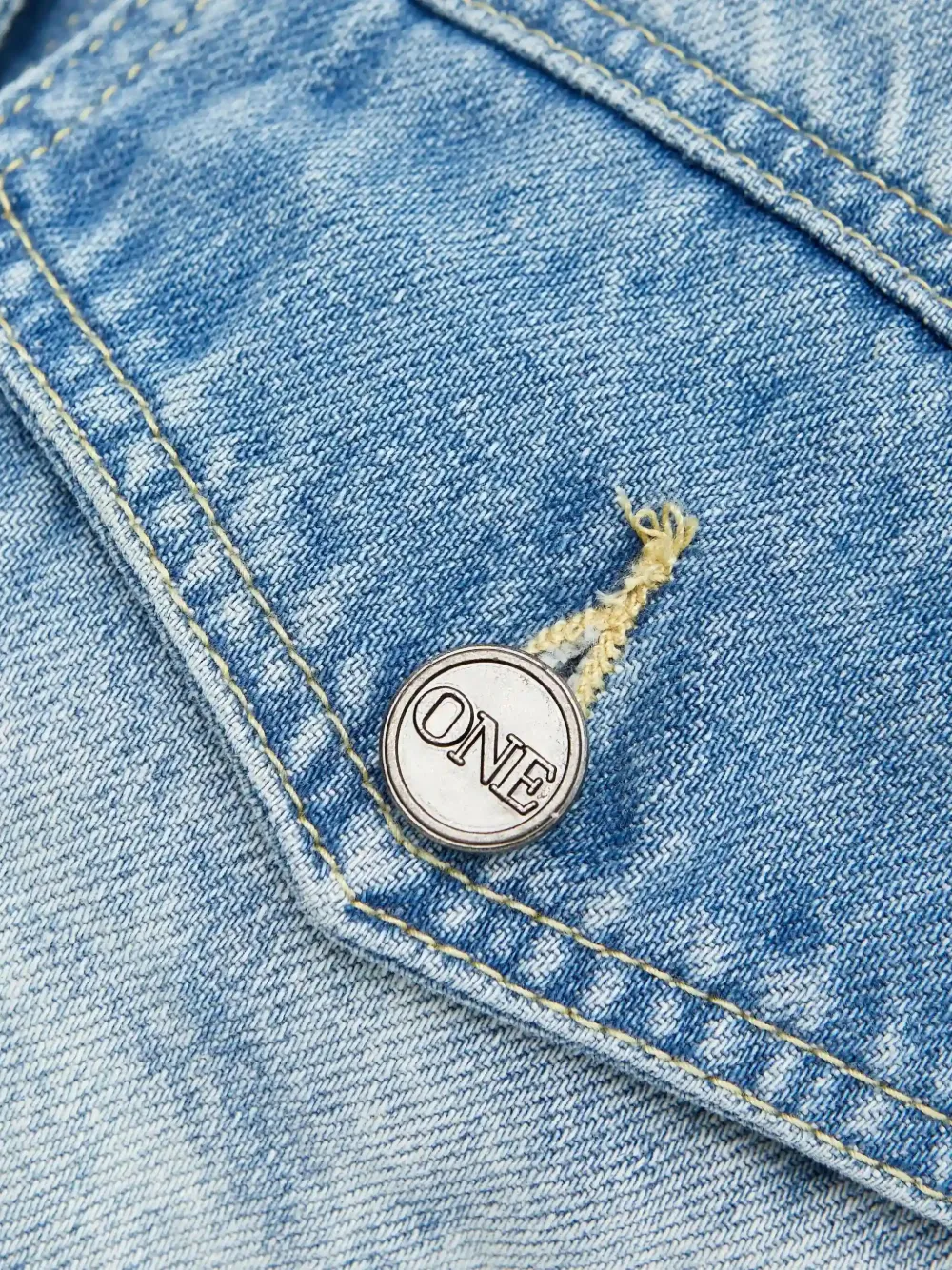 синий цвет, эффект состаренности, отделка заклепками сзади, застежка на пуговицы, два передних накладных кармана с клапанами, длинные рукава