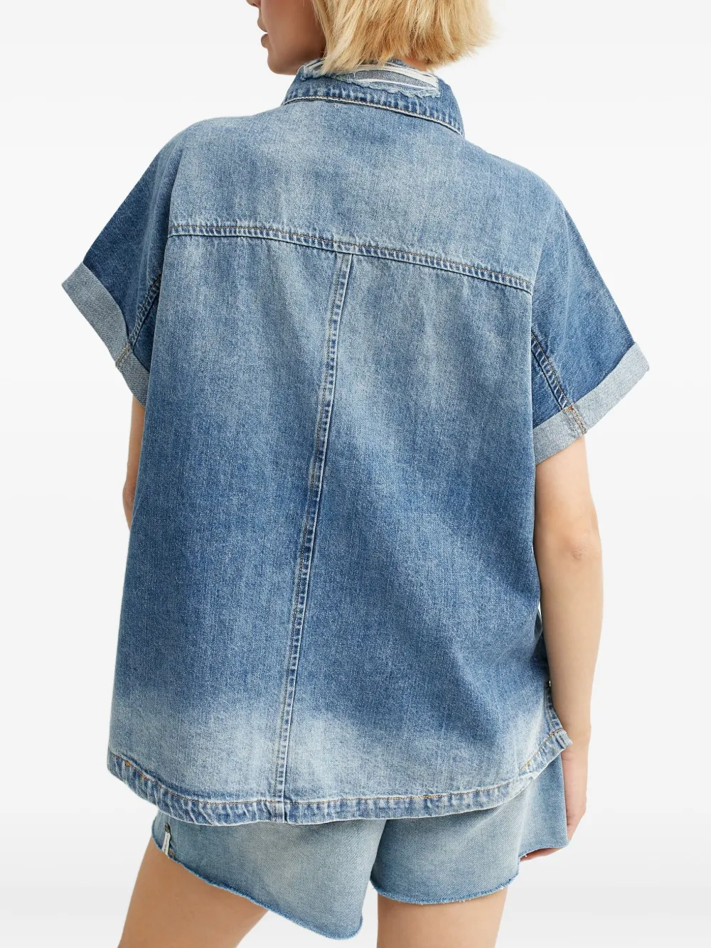 синий, застегивается на пуговицы, классический воротник, два накладных кармана спереди, рукава с подворотами