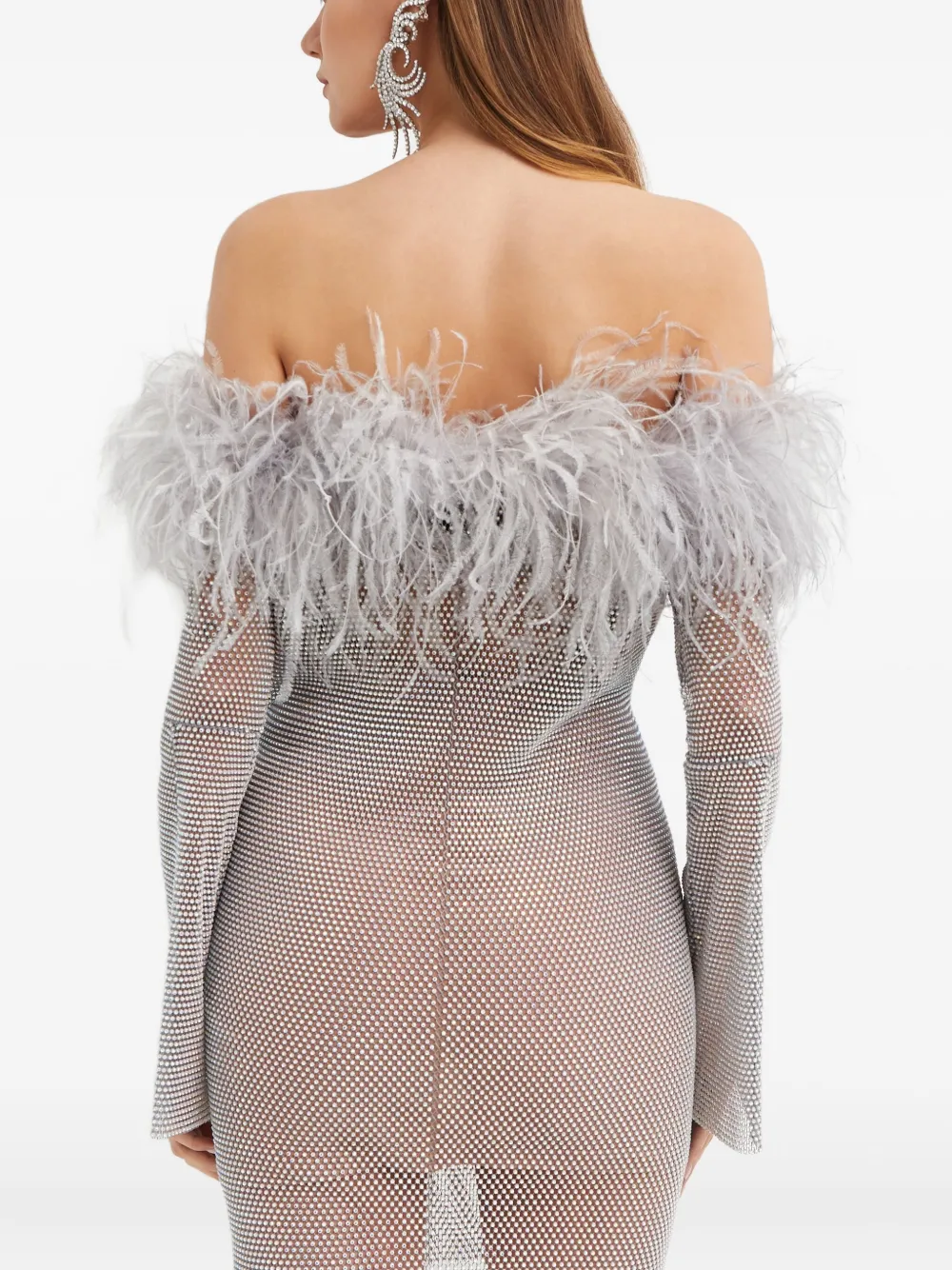 светло-серый, с отделкой кристаллами, перьевым декором, длинными рукавами, мини-длины, полупрозрачный