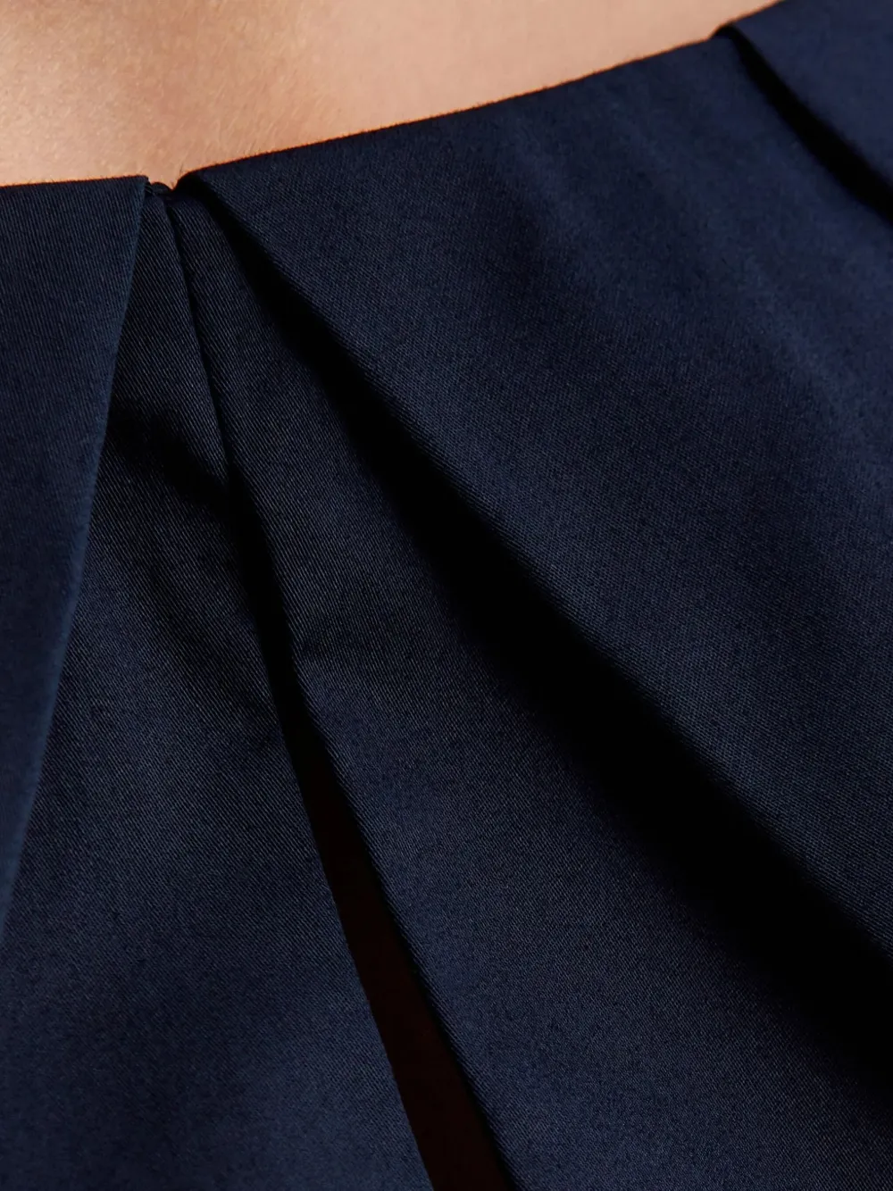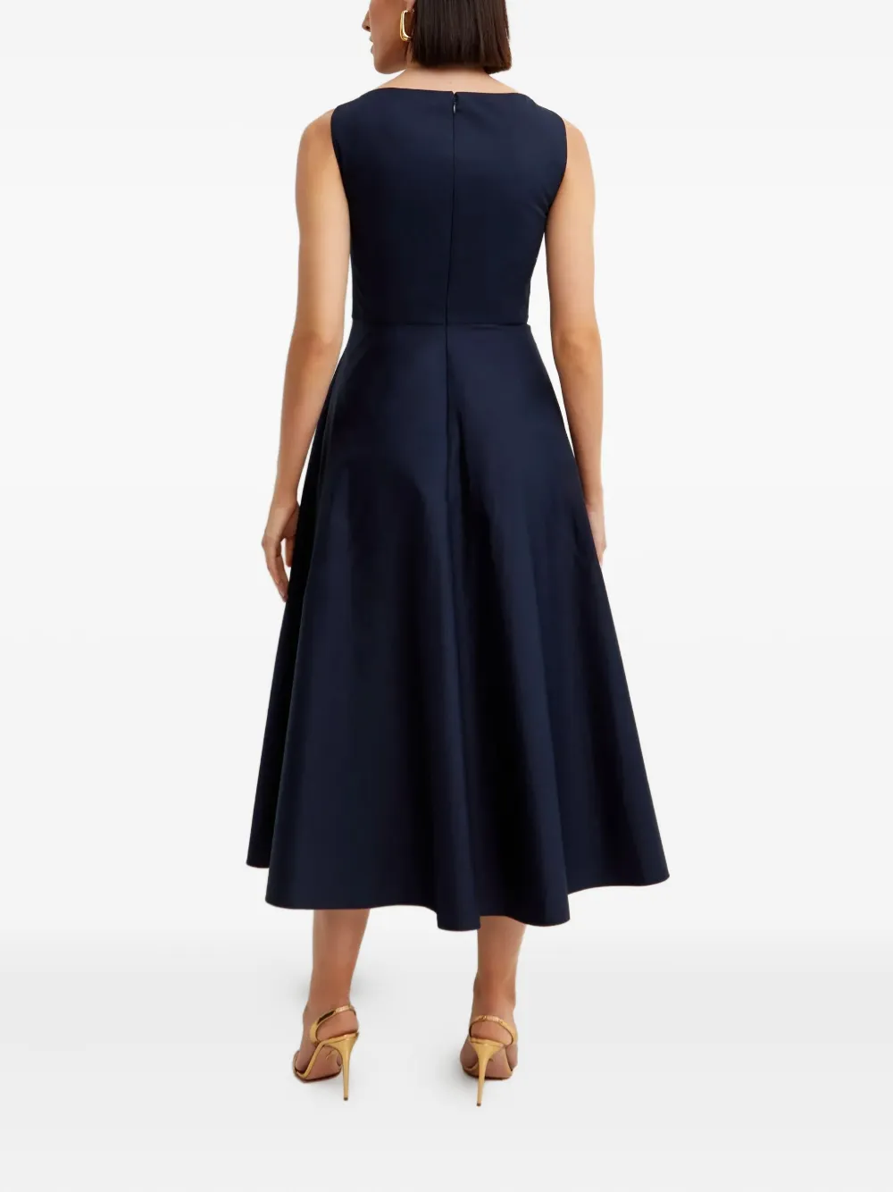 темно-синее платье с вырезом "лодочка", боковыми карманами, застежкой-молнией, без рукавов, расклешённой юбкой