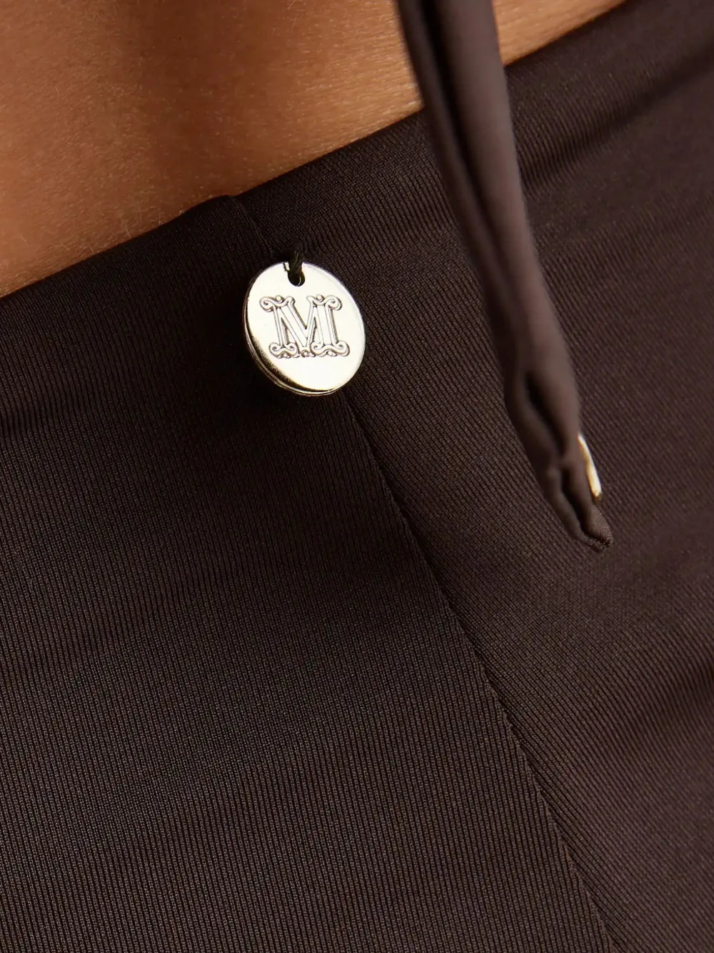 коричневый купальник с завышенной талией, золотистыми круглыми гравированными деталями, с полным покрытием
