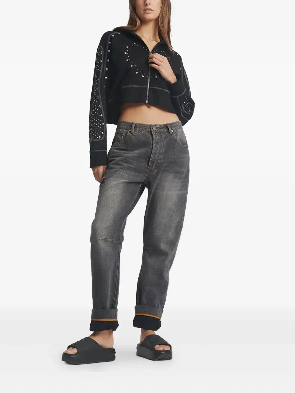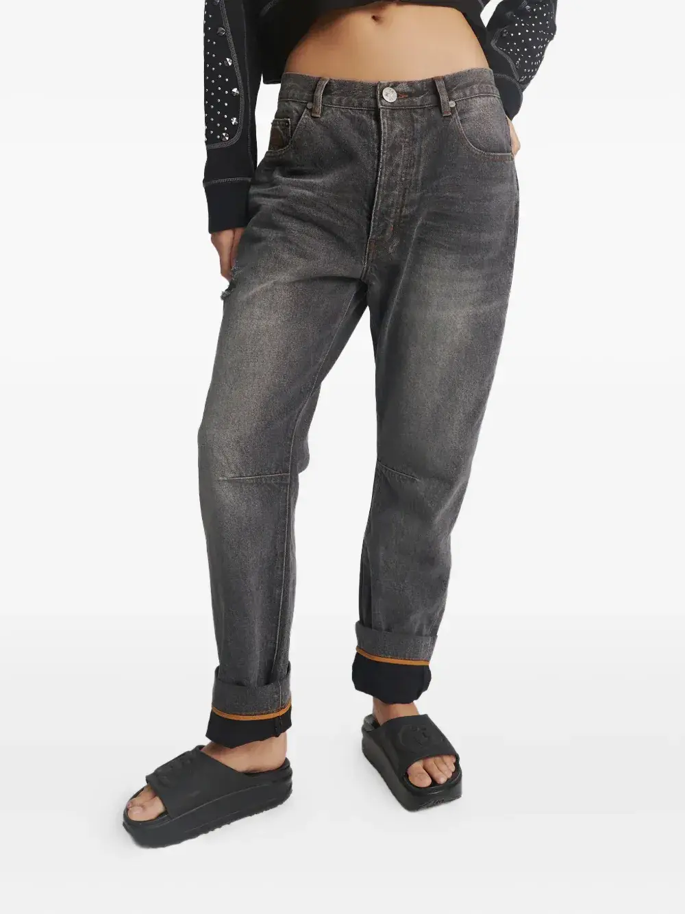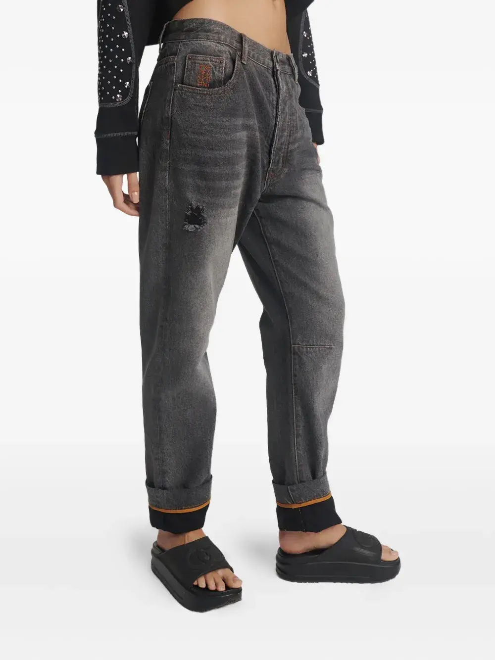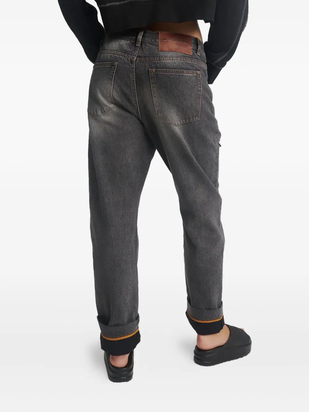 черные шлевки, нашивка с логотипом, подвернутые манжеты, классические пять карманов