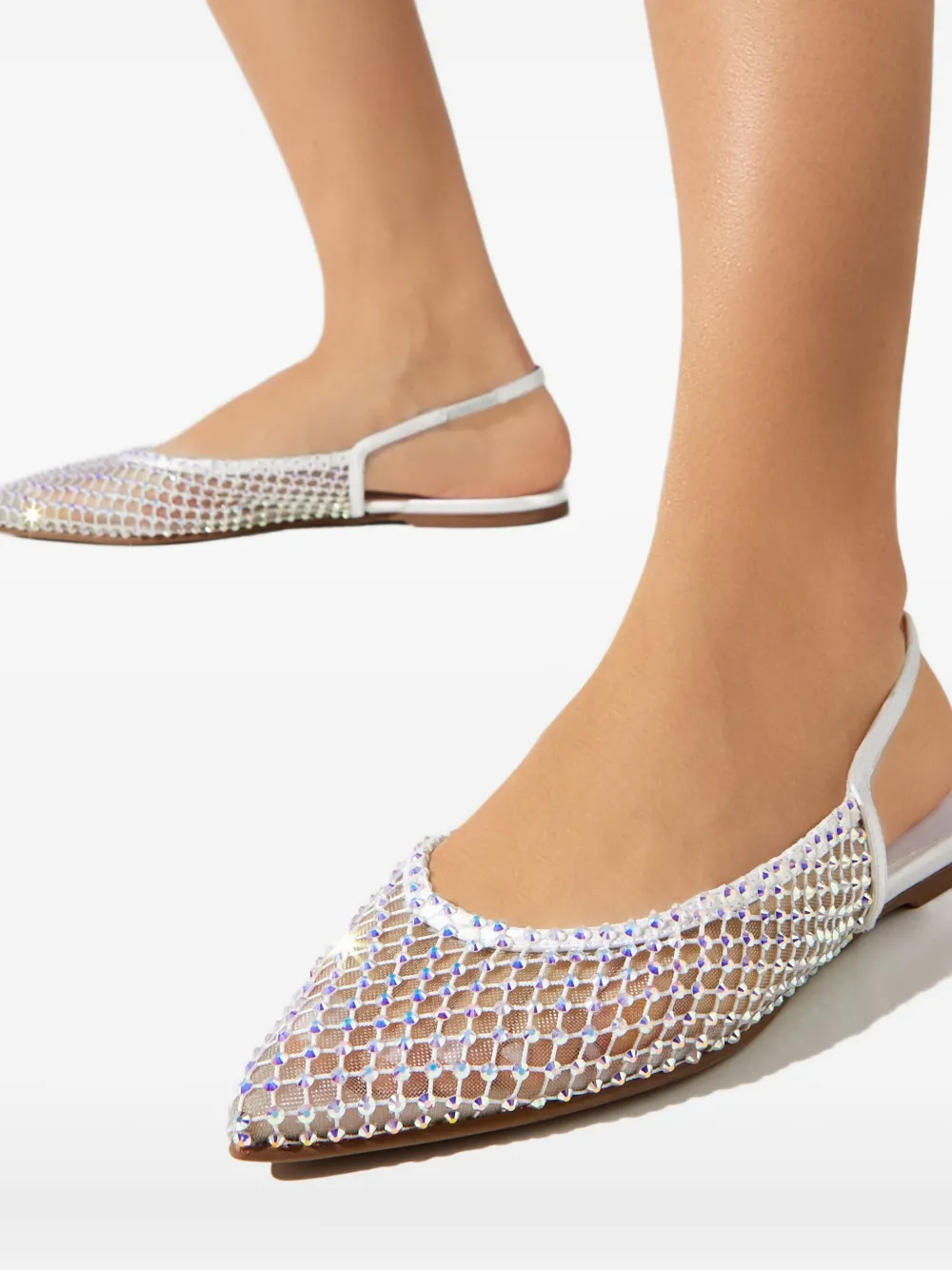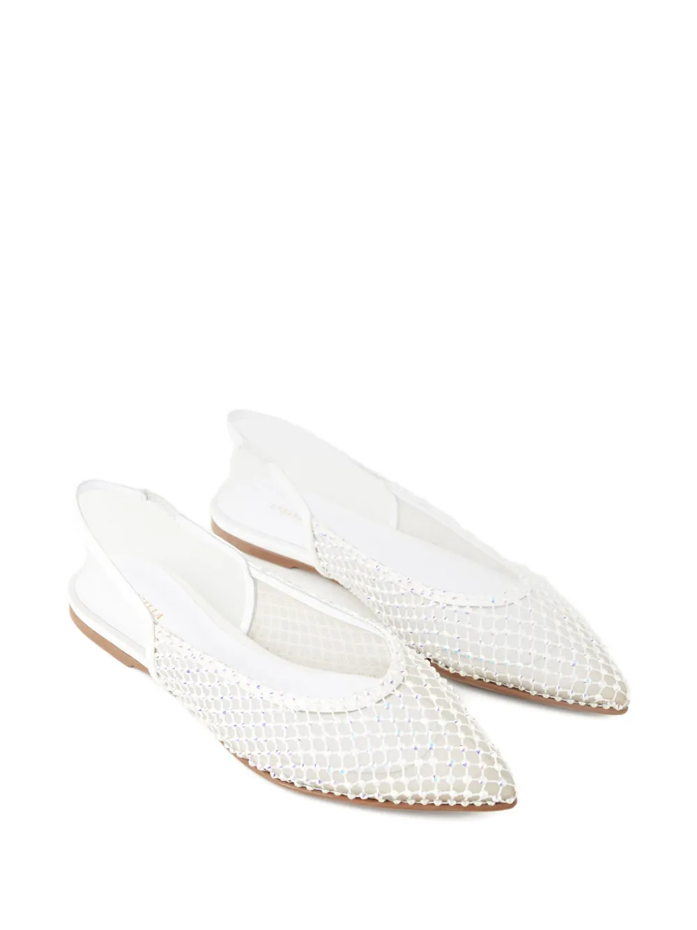 белый сетчатый верх с отделкой кристаллами, заострённый носок, эластичный ремешок сзади, фирменная стелька