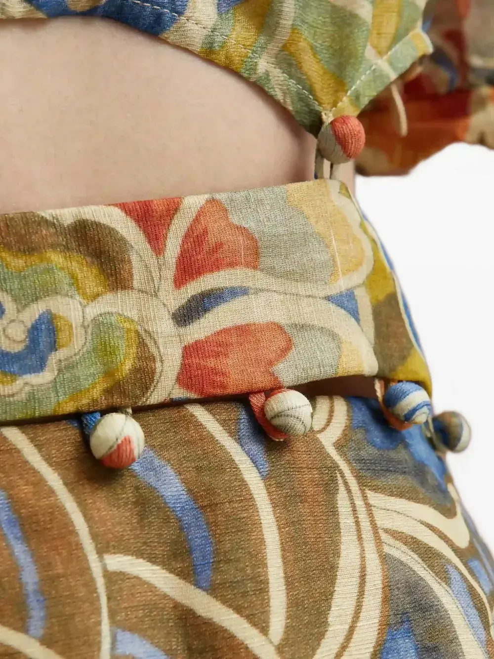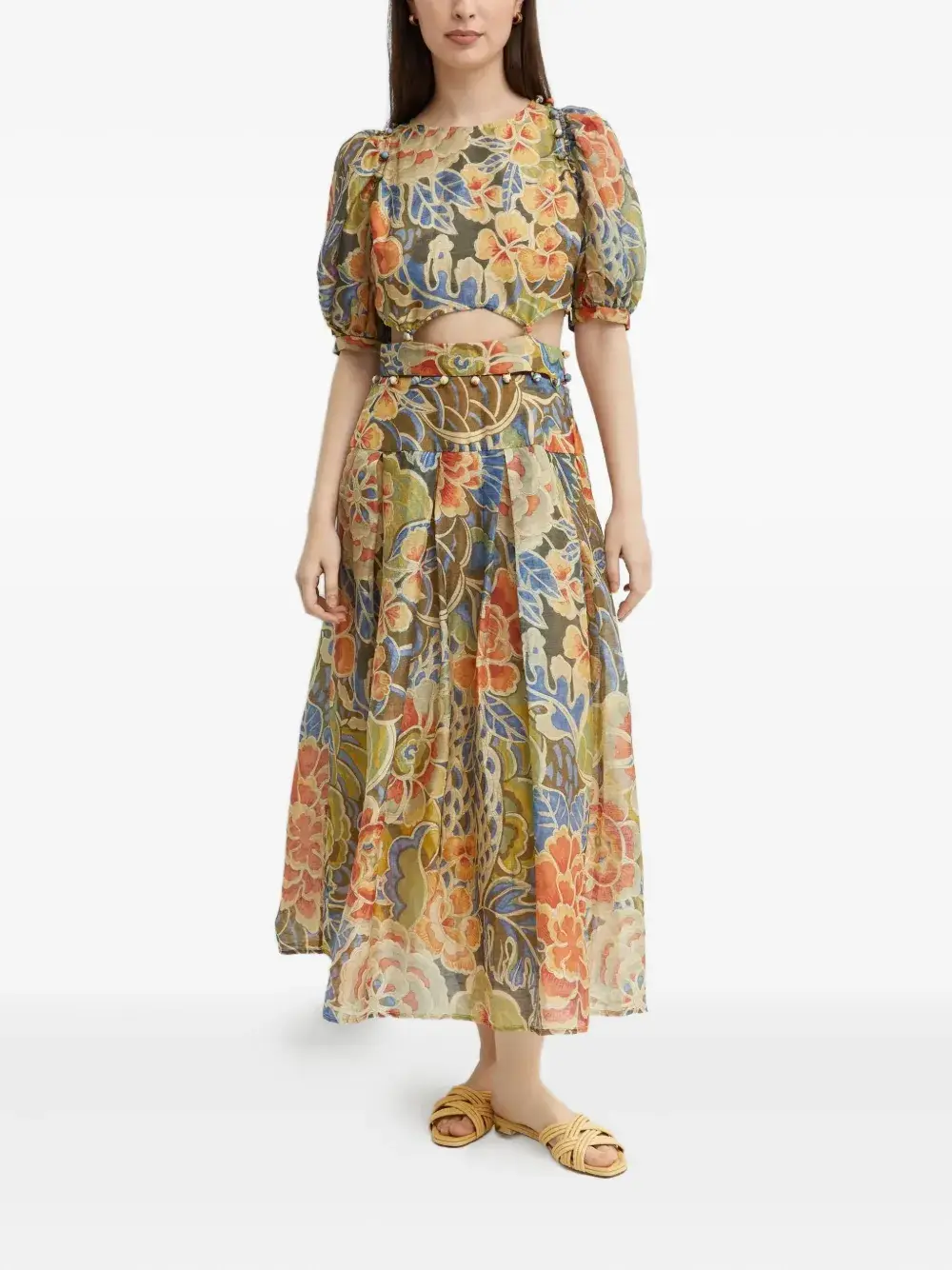 зеленое платье с цветочным принтом, круглым вырезом, рукавами-фонариками и вырезом