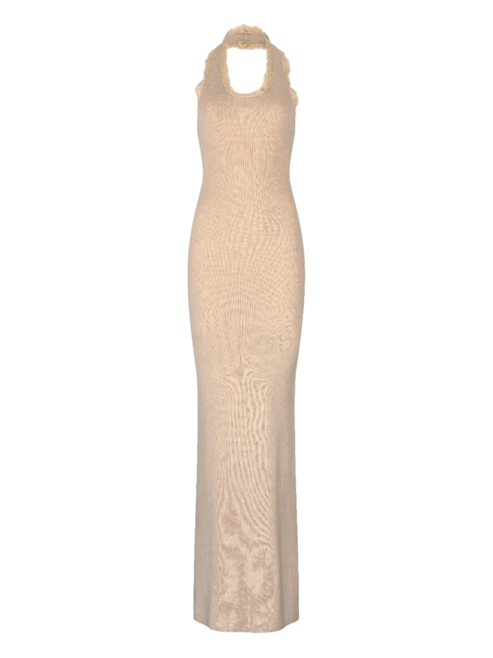 кремовое платье макси с воротником-халтер, кружевной отделкой, без рукавов, ребристой вязкой и прямым подолом