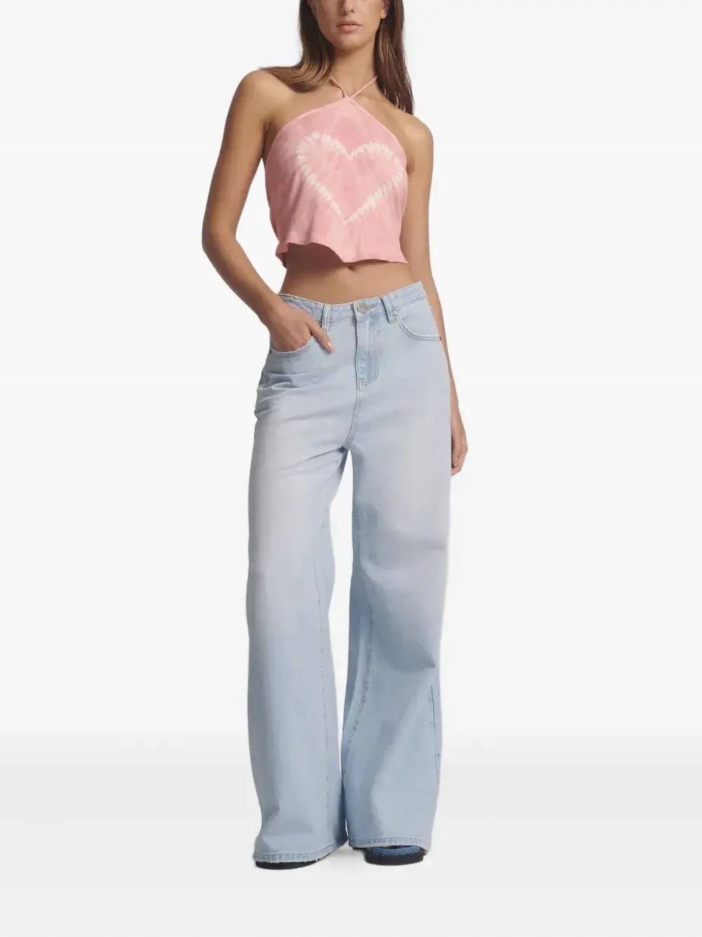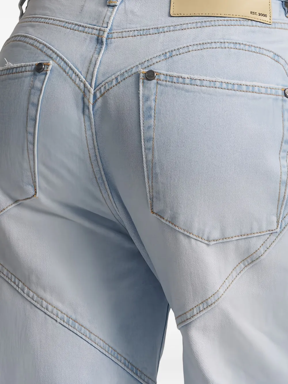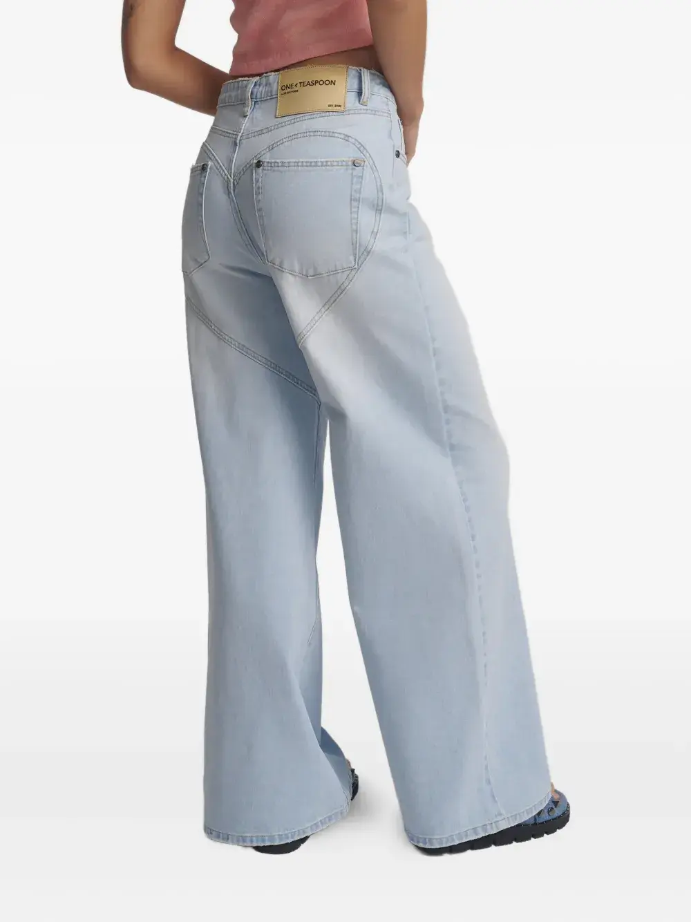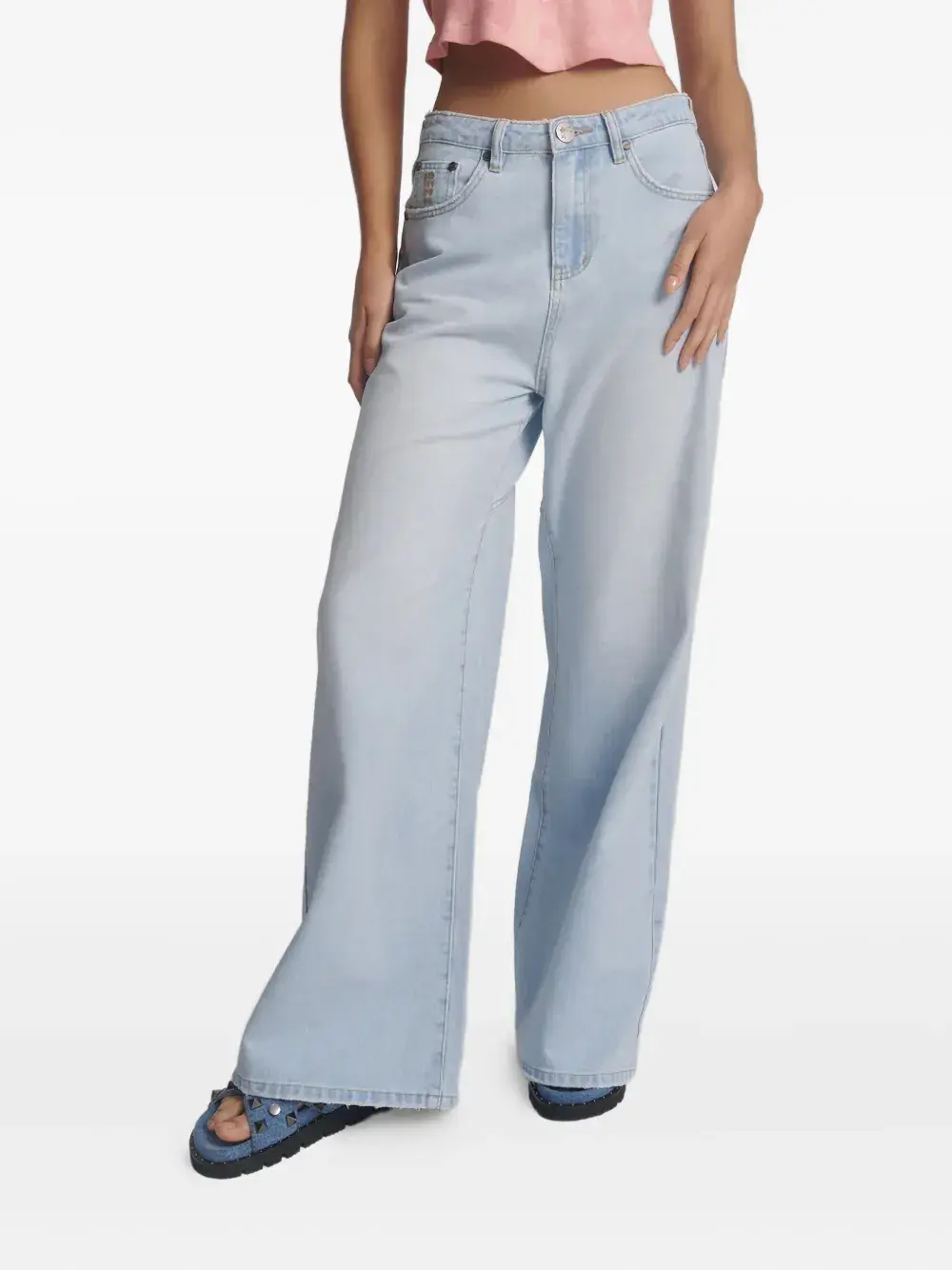 светло-голубой, сердцевидный шов сзади, застежка-молния и пуговица, кожаная нашивка с логотипом, широкие брюки, средняя посадка