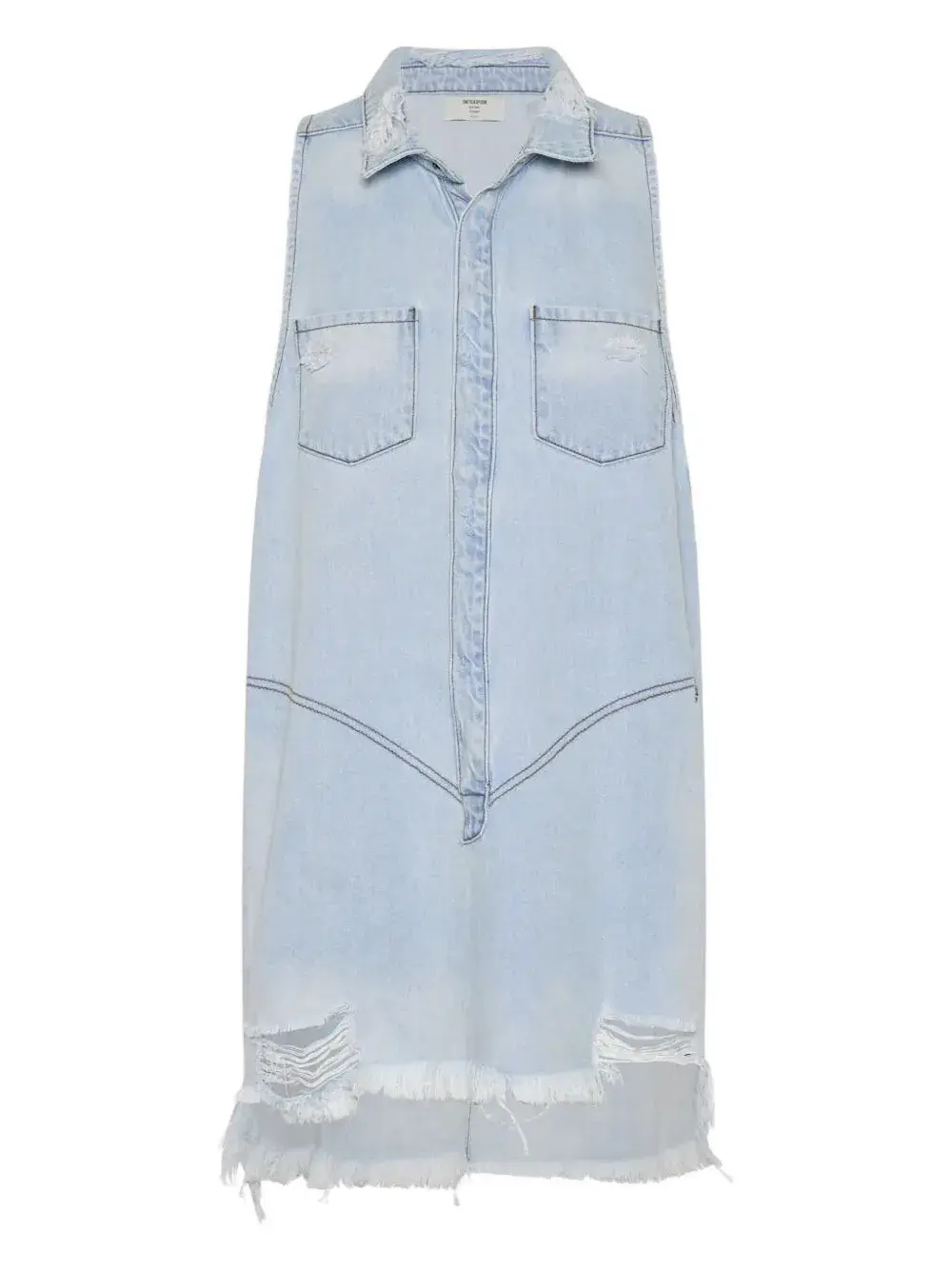 светло-голубой деним, текстурированный, отложной воротник, застежка на кнопки спереди, два нагрудных накладных кармана, необработанный (рваный) край