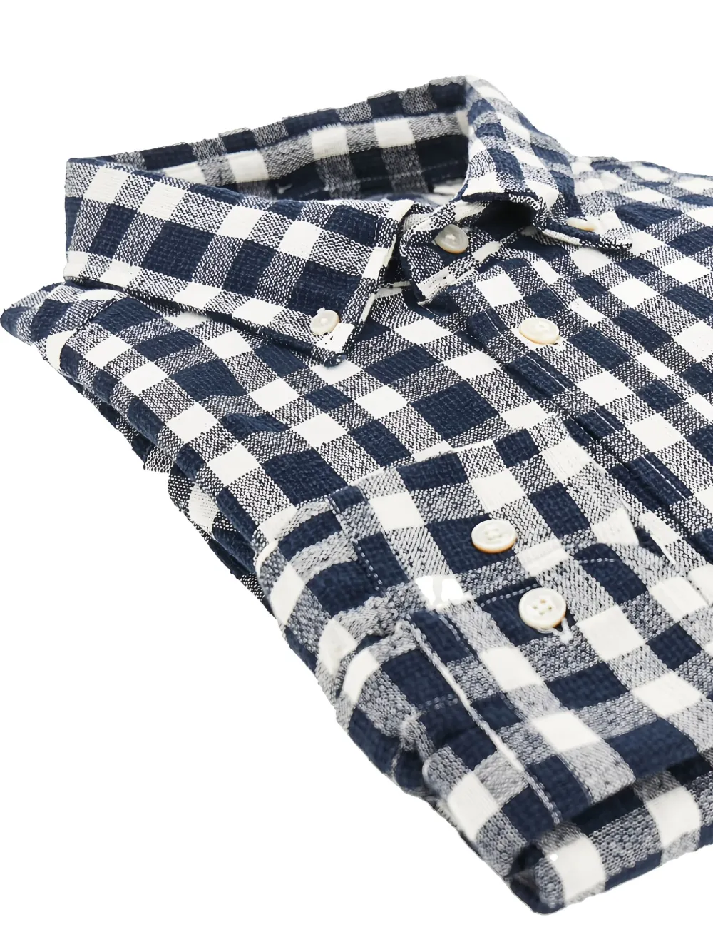 темно-синяя рубашка в клетку гингем, с застежкой на пуговицы, воротник на пуговицах, длинные рукава, застежка на пуговицы