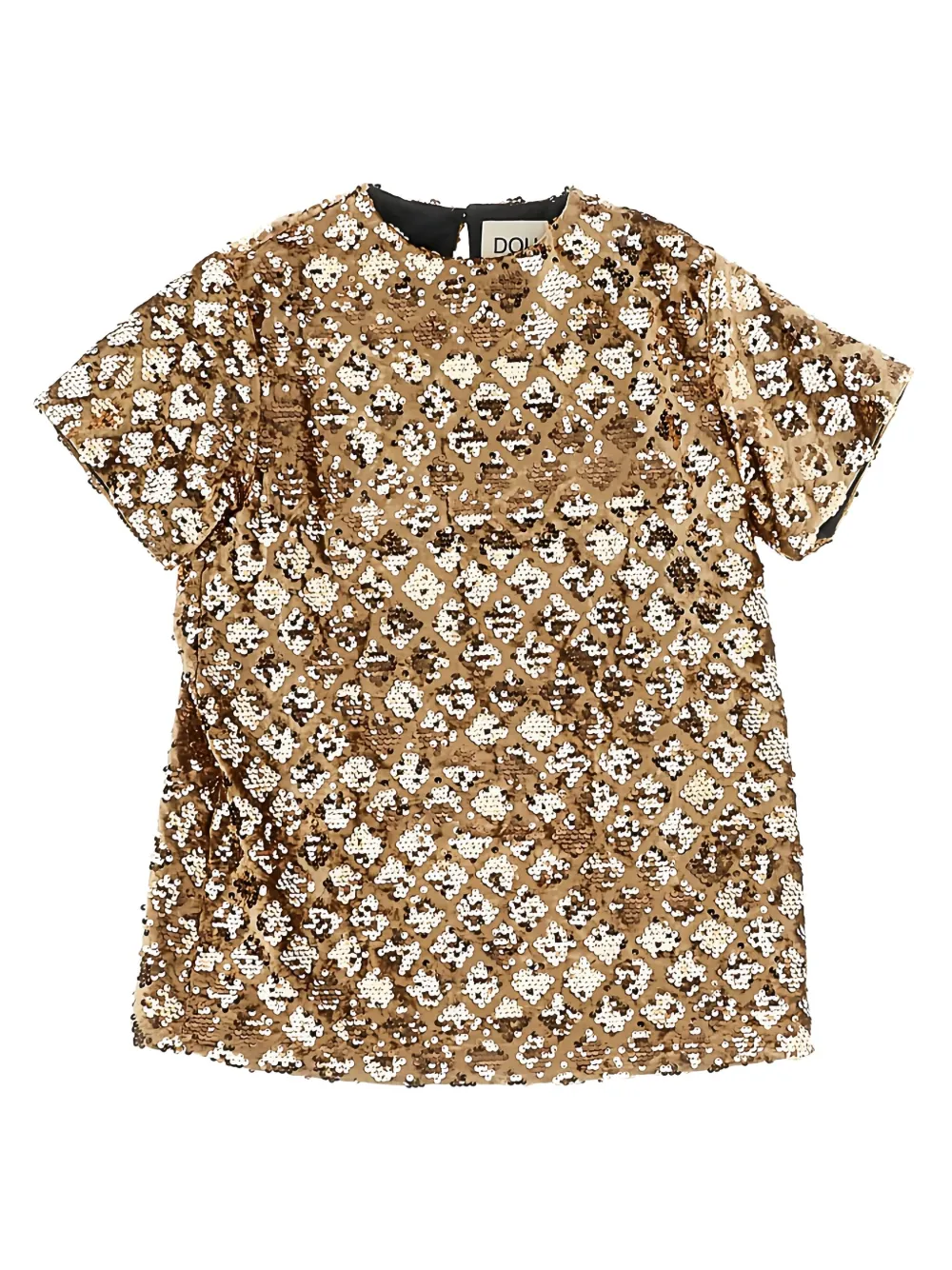 золотистый цвет, узор по всей поверхности, короткие рукава, круглый вырез