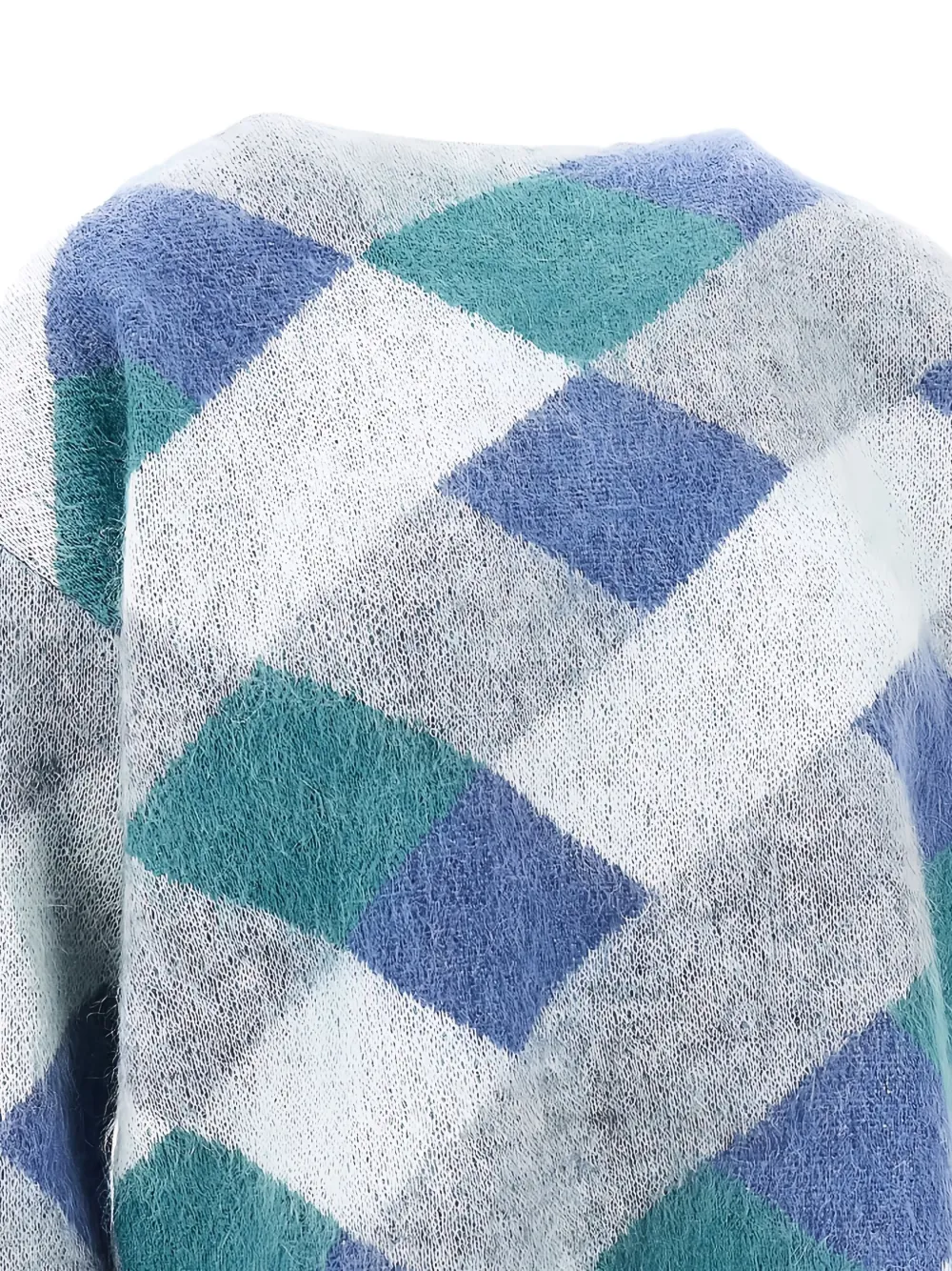 серый разноцветный джемпер с ромбовидным узором, круглым вырезом и длинными рукавами
