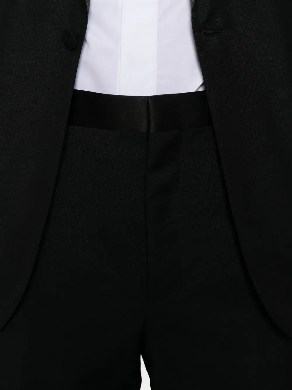 черный атласный пояс, боковые карманы в швах, прорезные задние карманы, застежка спереди на потайную молнию