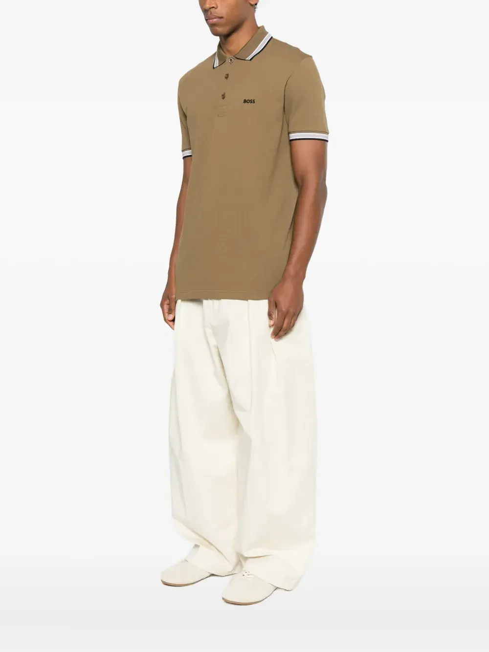 коричневая футболка-поло с полосатыми отделками, застёжкой на пуговицы, короткими рукавами, логотипом и воротником поло