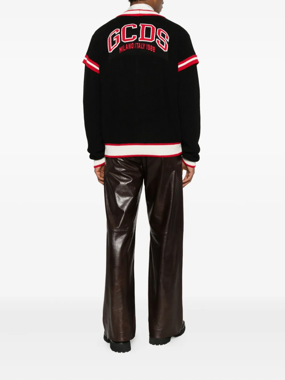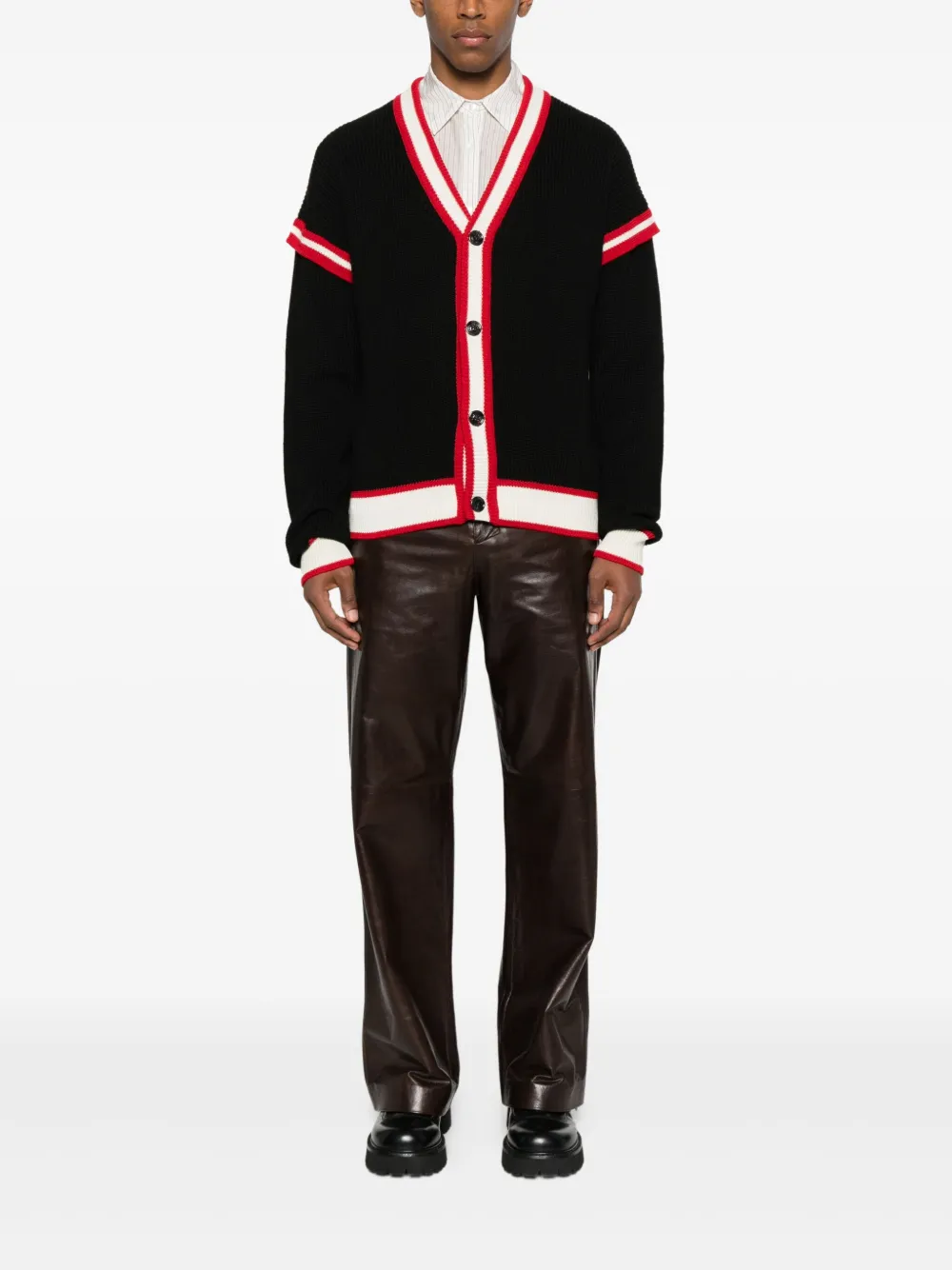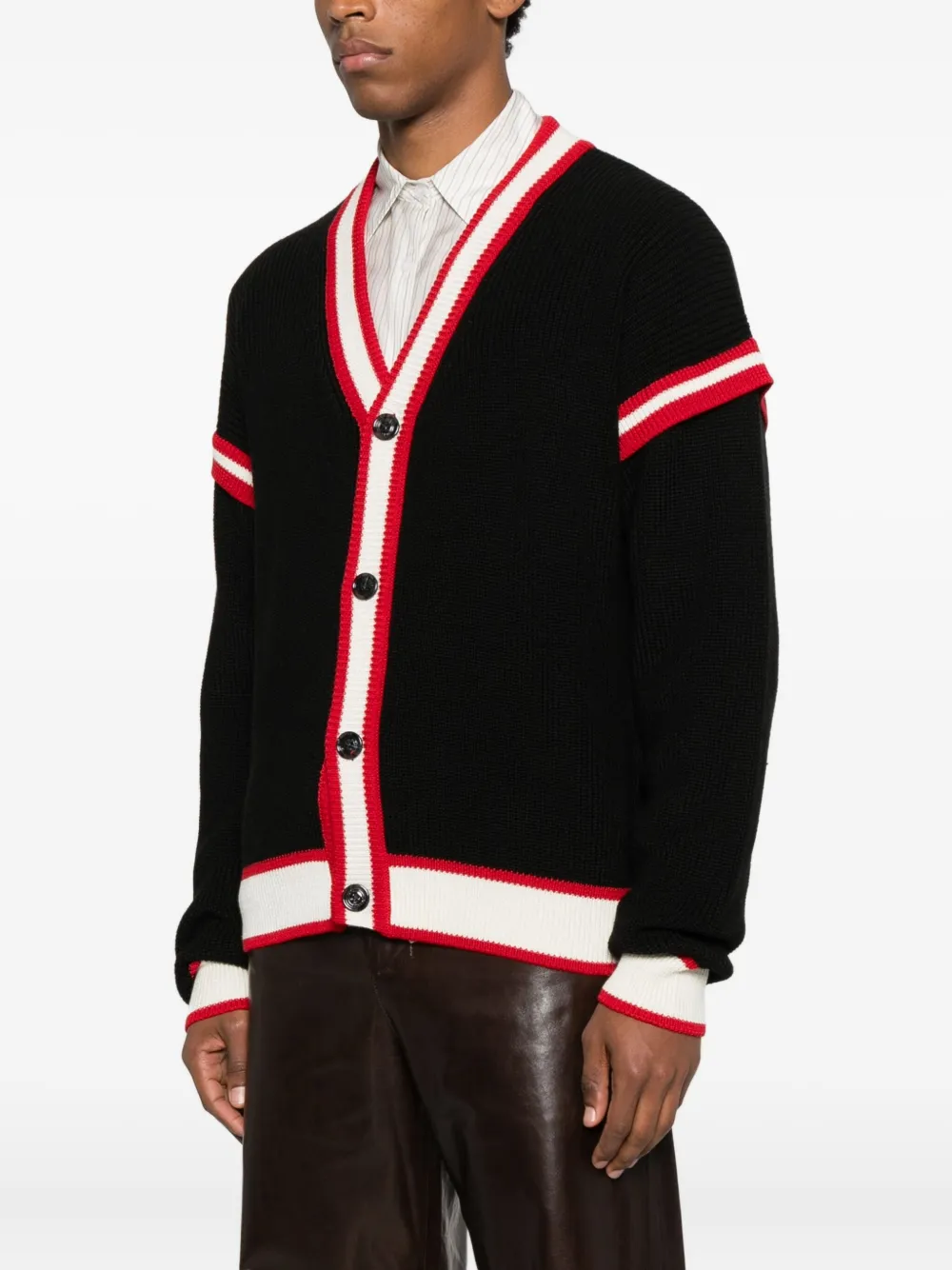 черный кардиган с V-образным вырезом, застежкой на пуговицы, длинными рукавами, полосатой отделкой и графическим принтом