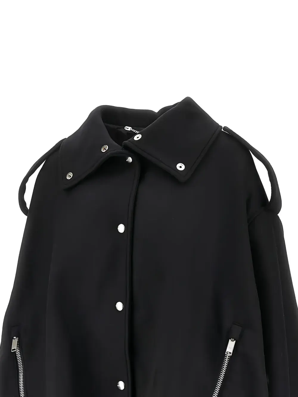 черная шерсть, фурнитура серебристого оттенка, застежка-молния, застежка на пуговицы, воротник, плечевые погоны