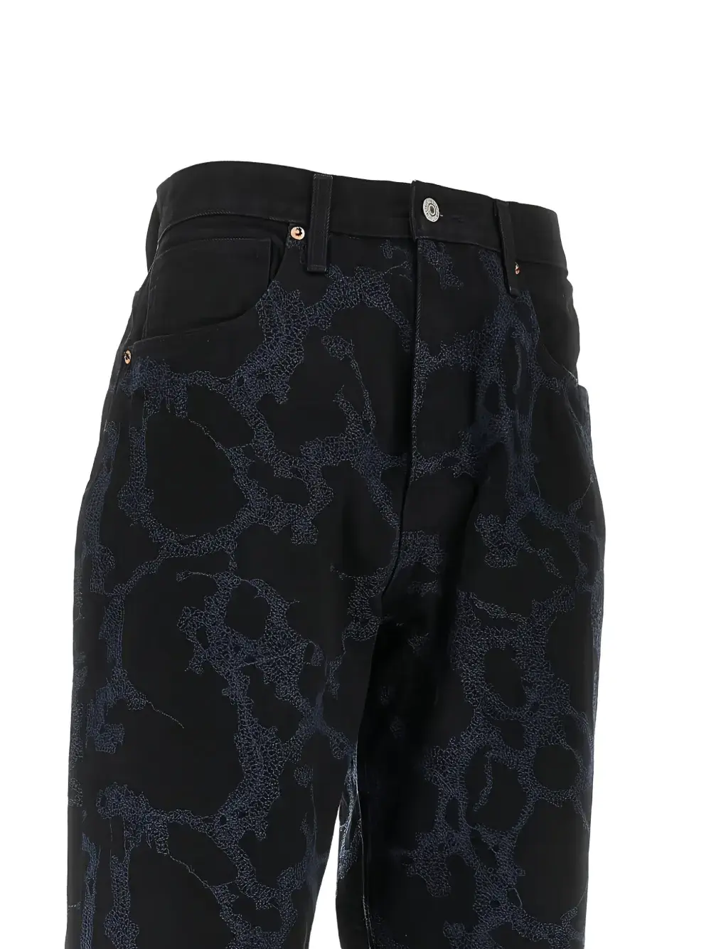чёрные/синие джинсы с абстрактным узором, пять карманов, шлёвки для пояса, застёжка на пуговицах, хлопковый варёный деним