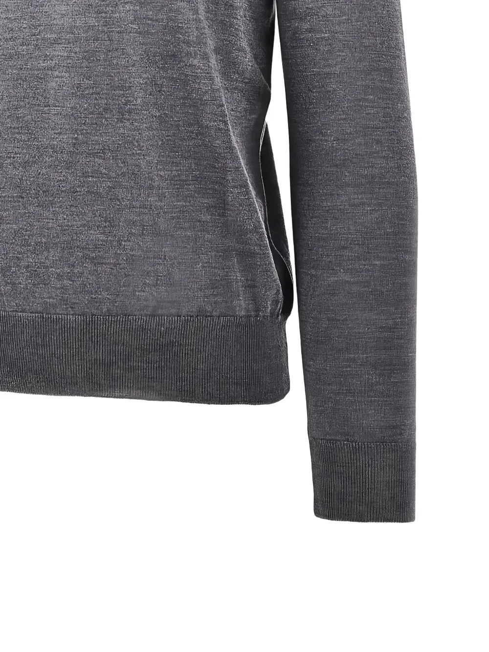 серый свитер с воротником-стойкой, ребристой отделкой низа и манжет, длинными рукавами