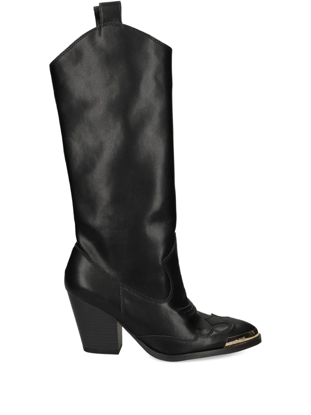 чёрные туфли на толстом каблуке с петлями для надевания, заострённым носком и золотистым мысом