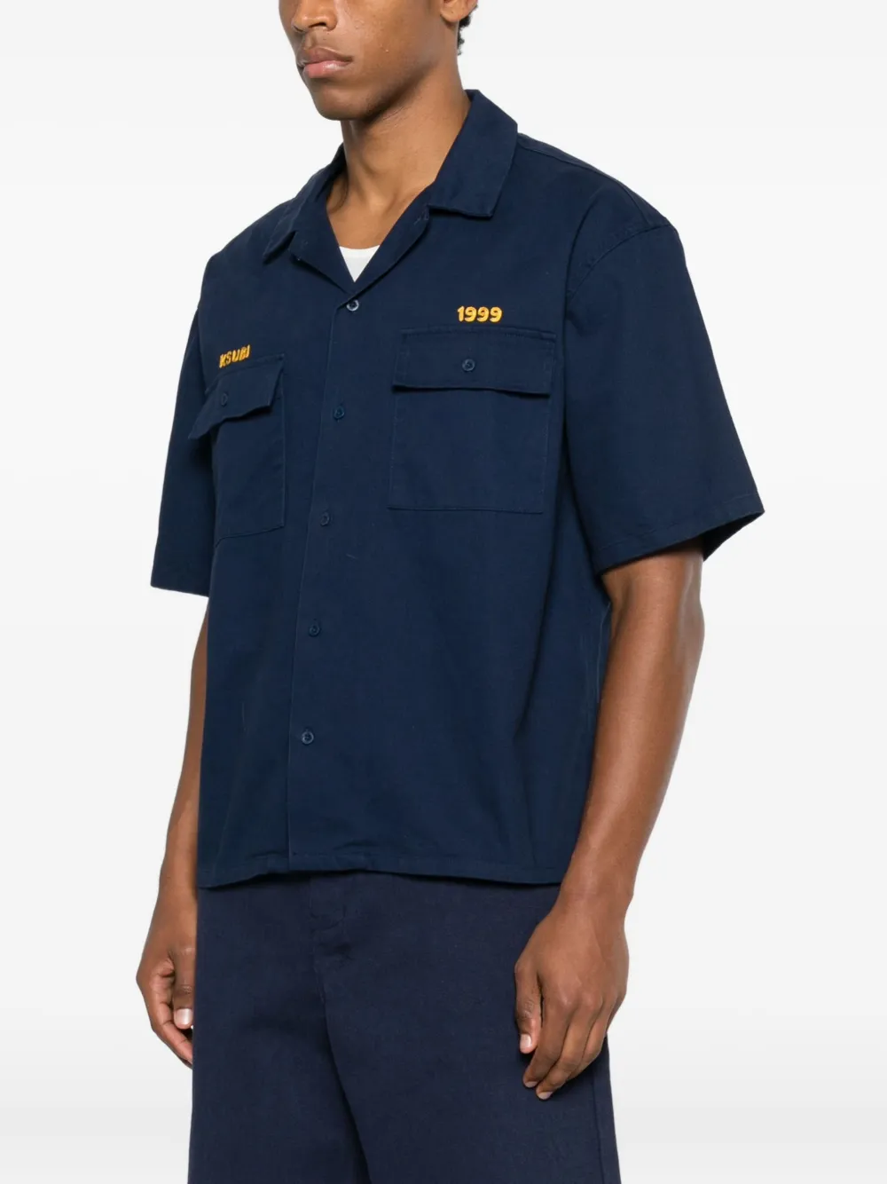 синие нагрудные карманы, застежка на пуговицы, короткие рукава, вышитые детали, отложной воротник