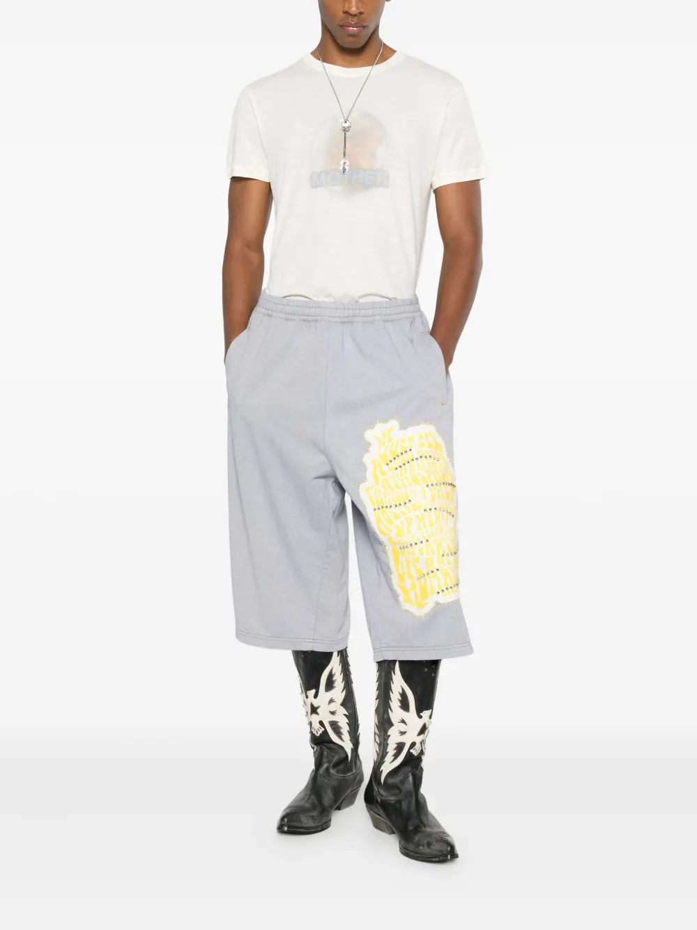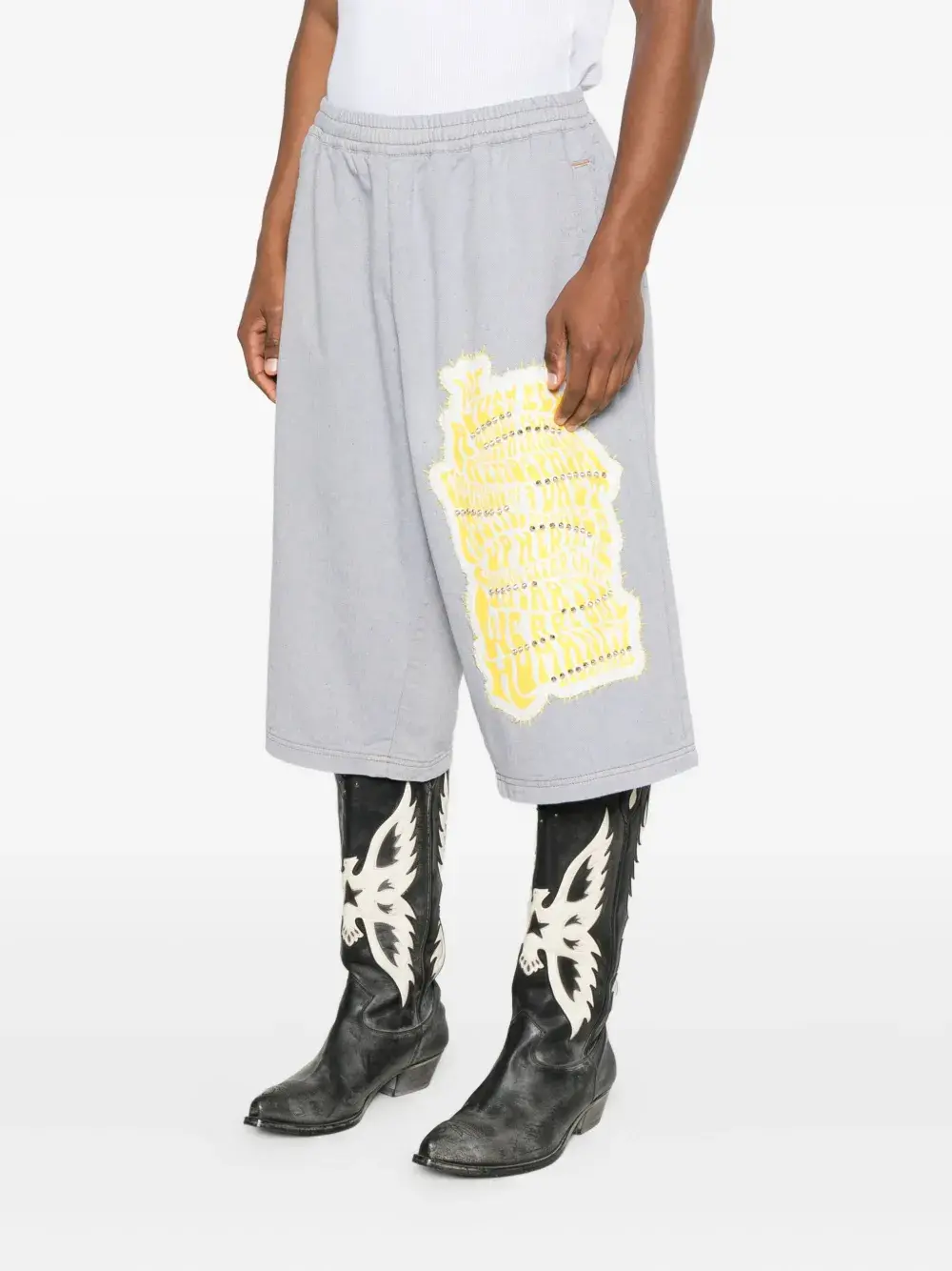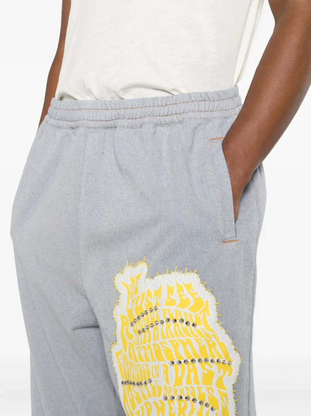 синяя нашивка, украшение заклёпками, эластичный пояс, боковые прорезные карманы