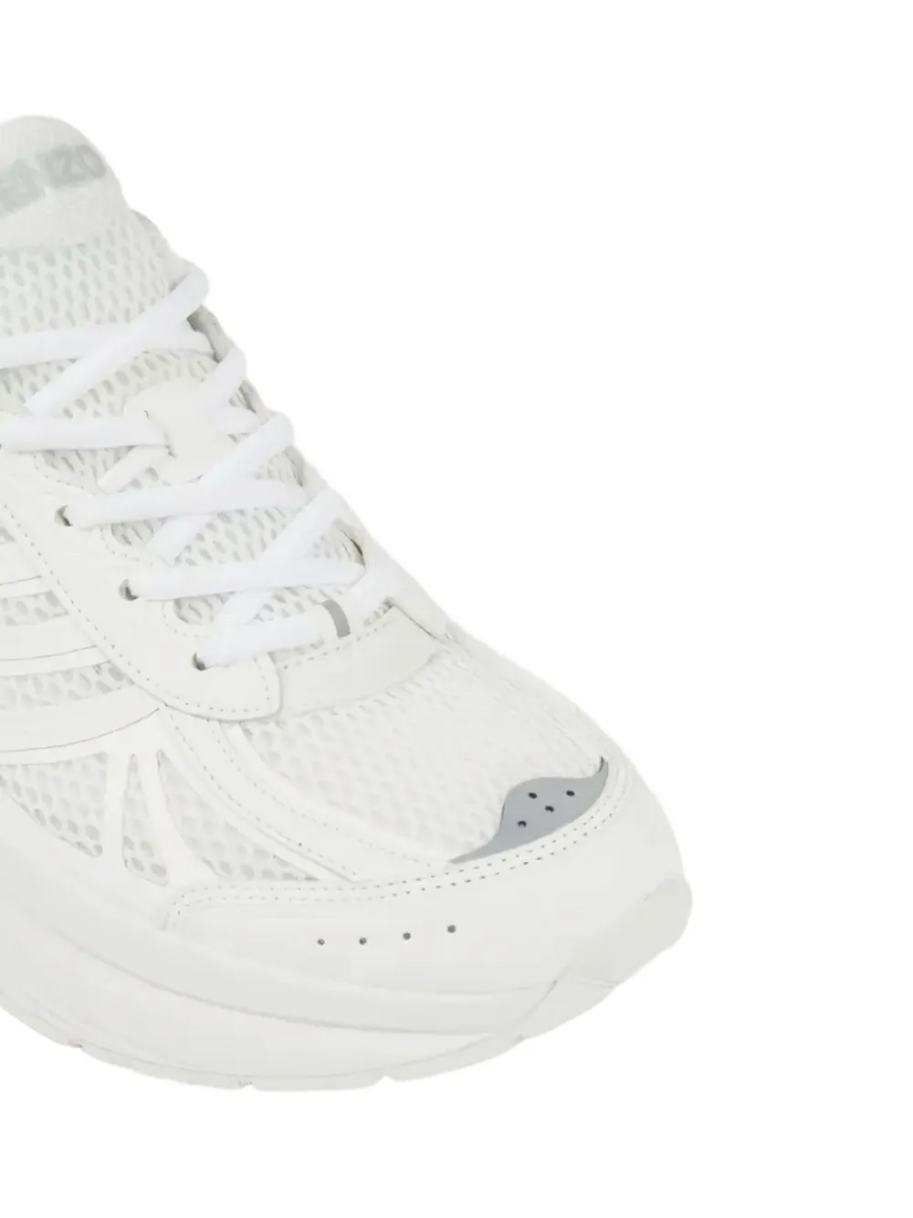 белый сетчатый дизайн, панельная конструкция, отделка логотипом, шнуровка, круглый носок, резиновая подошва