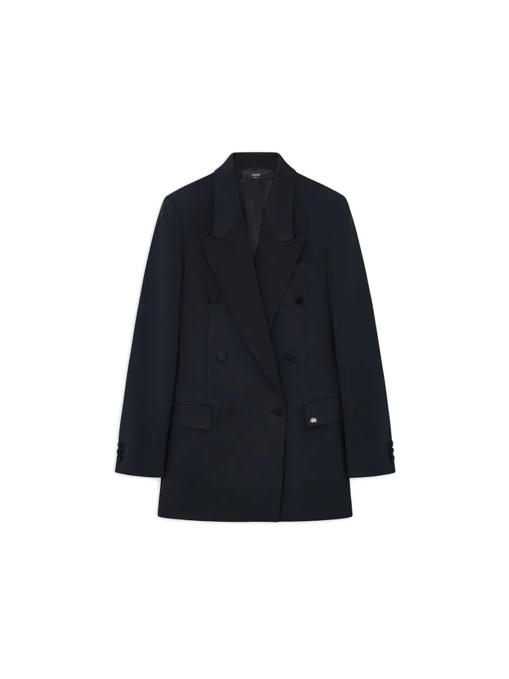 чёрный двубортный пиджак с застёжкой на пуговицы, лацканами с острыми концами, передними клапанными карманами и манжетами на пуговицах