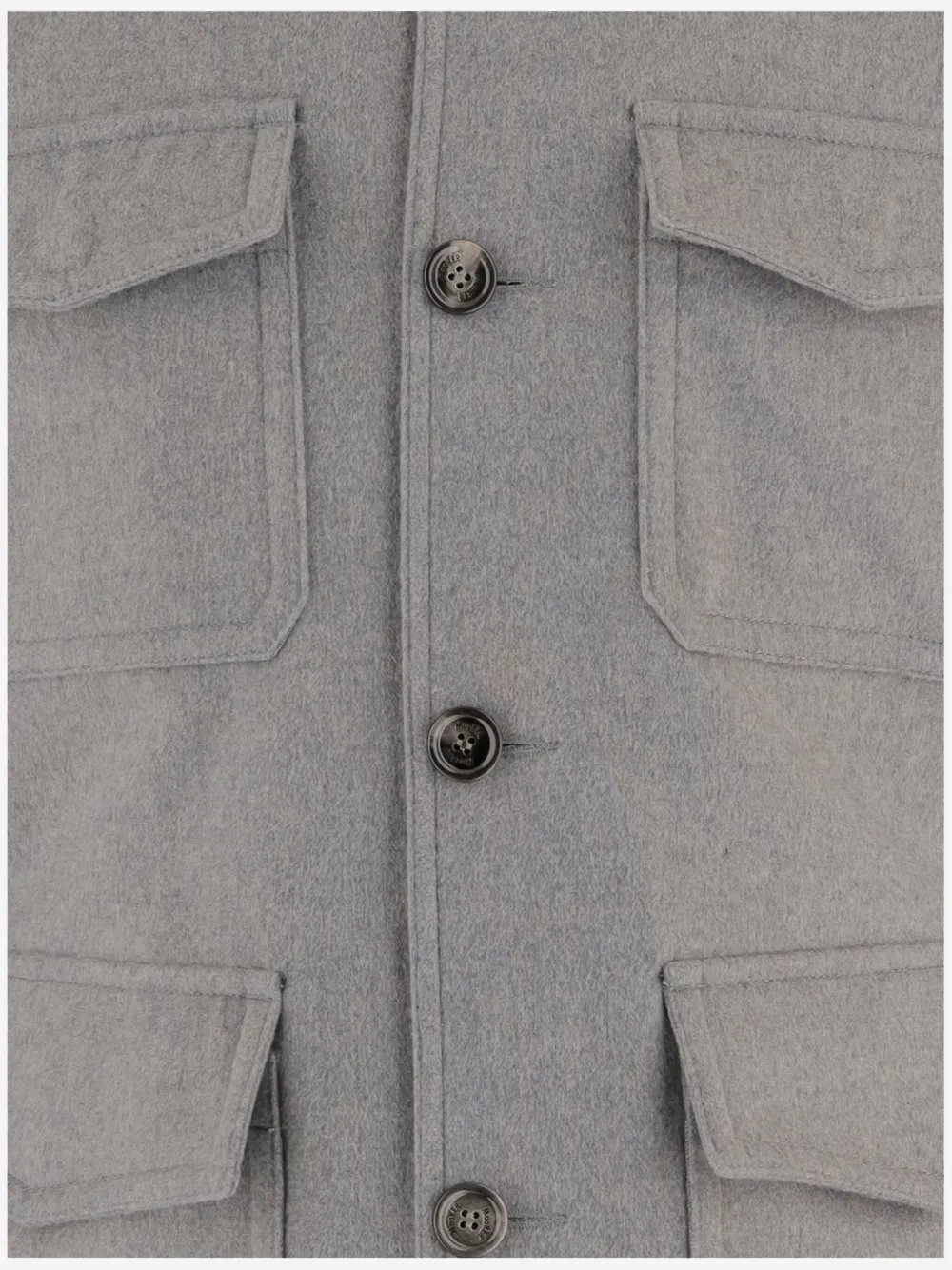 светло-серый худи на завязках, застежка на молнию и пуговицы, четыре кармана