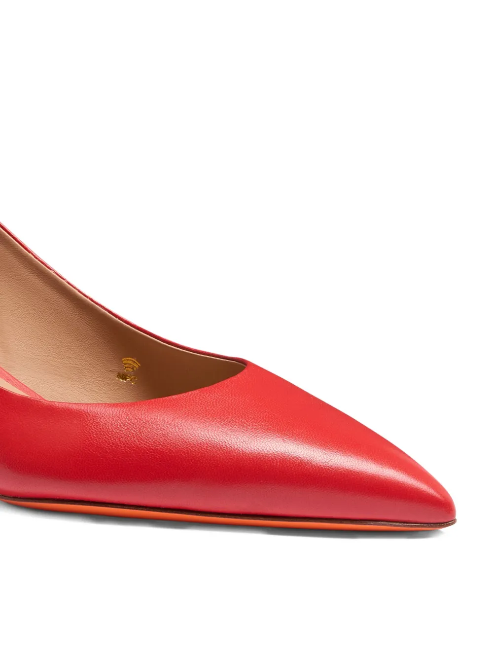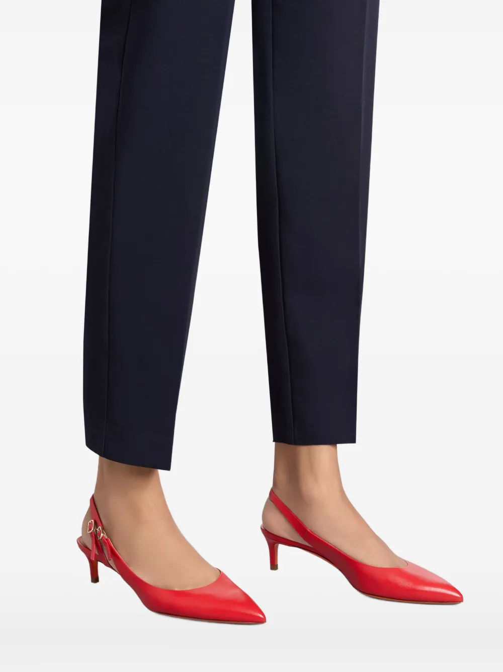 красные кожаные туфли с заострённым носком, средней высоты каблуком, ремешком на пятке и застежкой-пряжкой