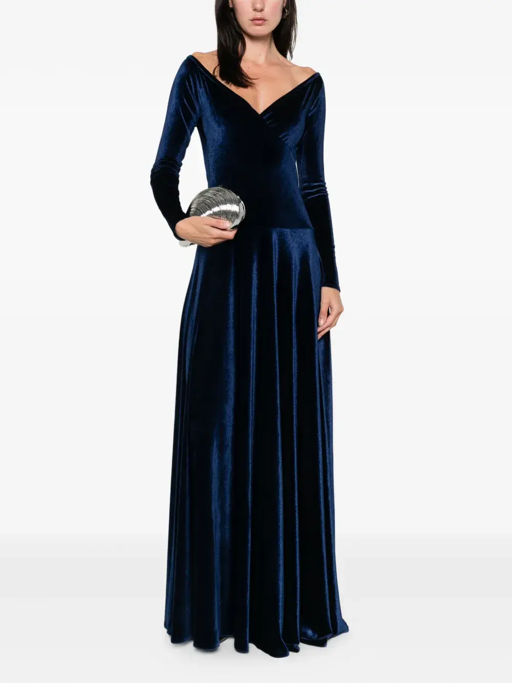 темно-синий бархат, длинные рукава, V-образный вырез, длина в пол