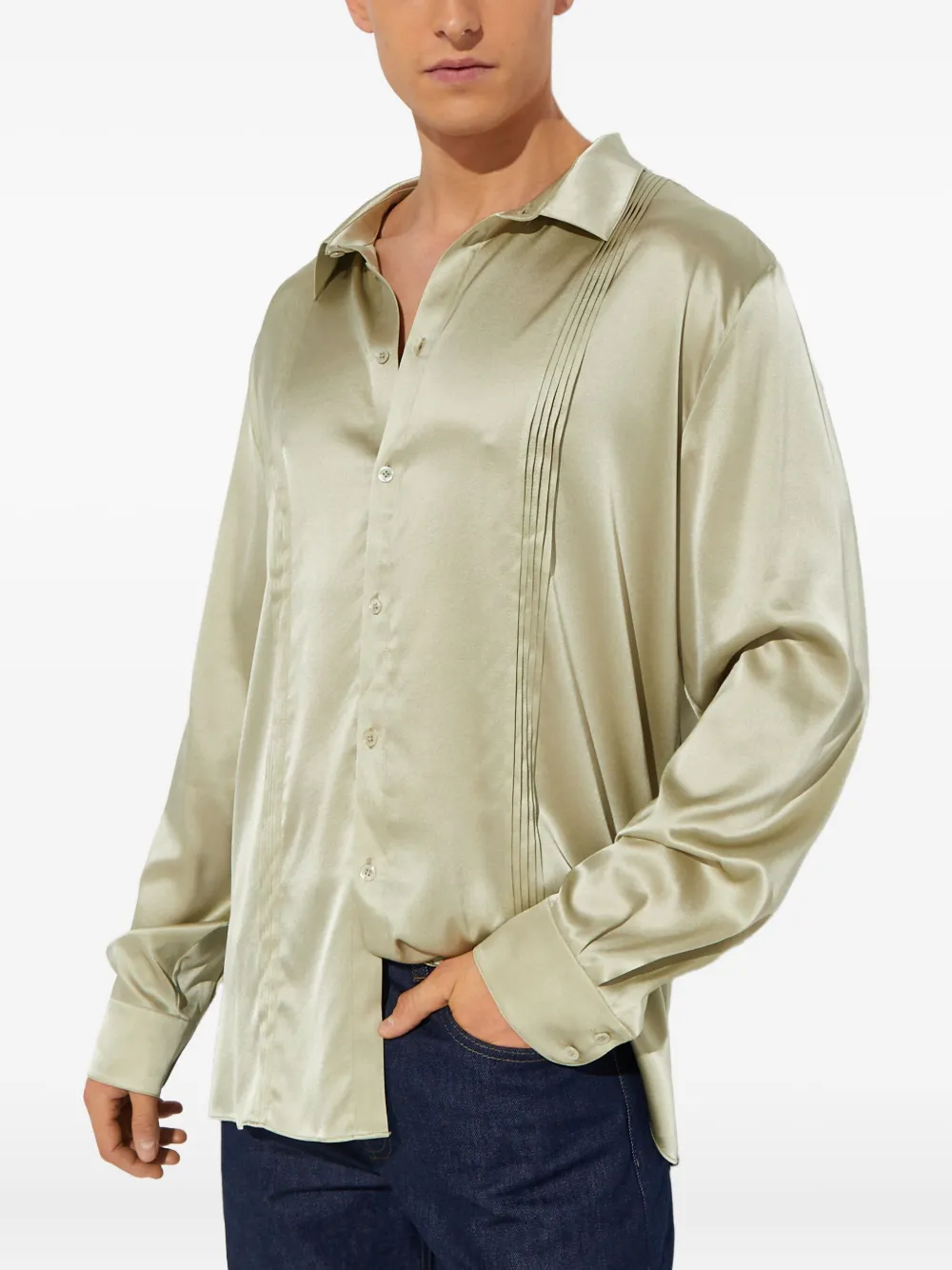 бежевый шелк, застежка на пуговицы, воротник, манжеты на пуговицах, плиссированные детали