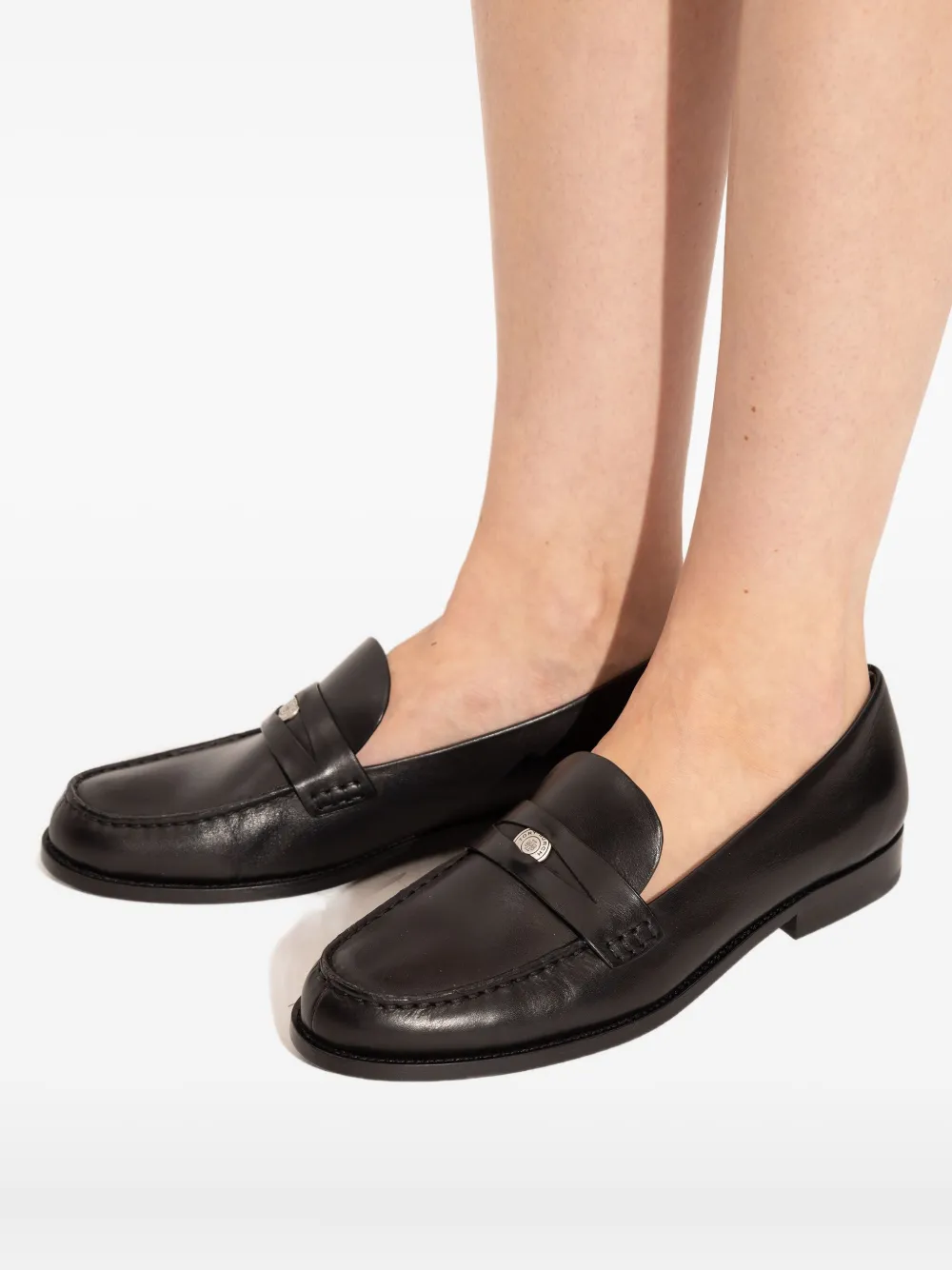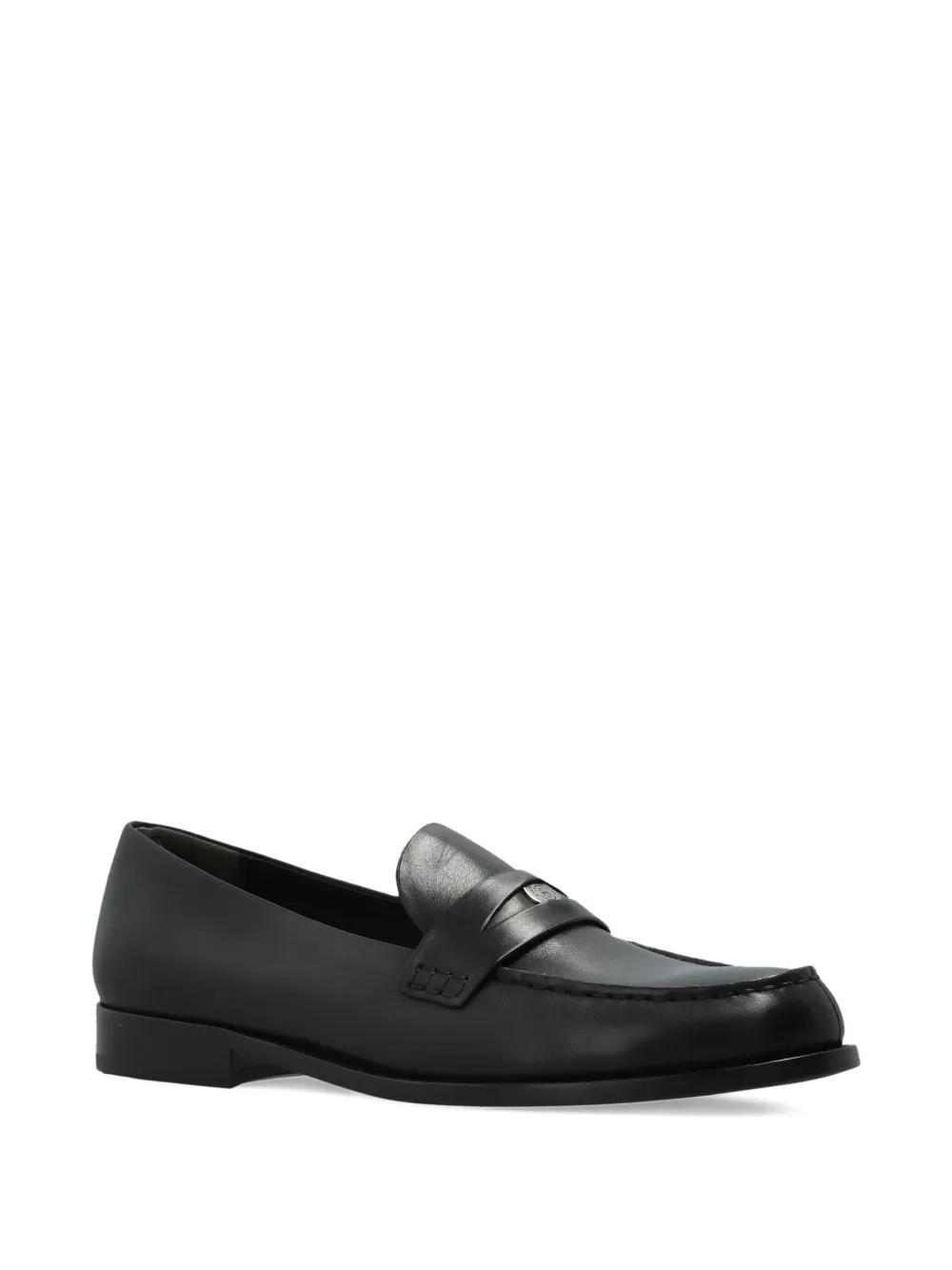 черный верх из кожи, прорезь для пенни, круглый носок, плоский каблук, тональная прострочка