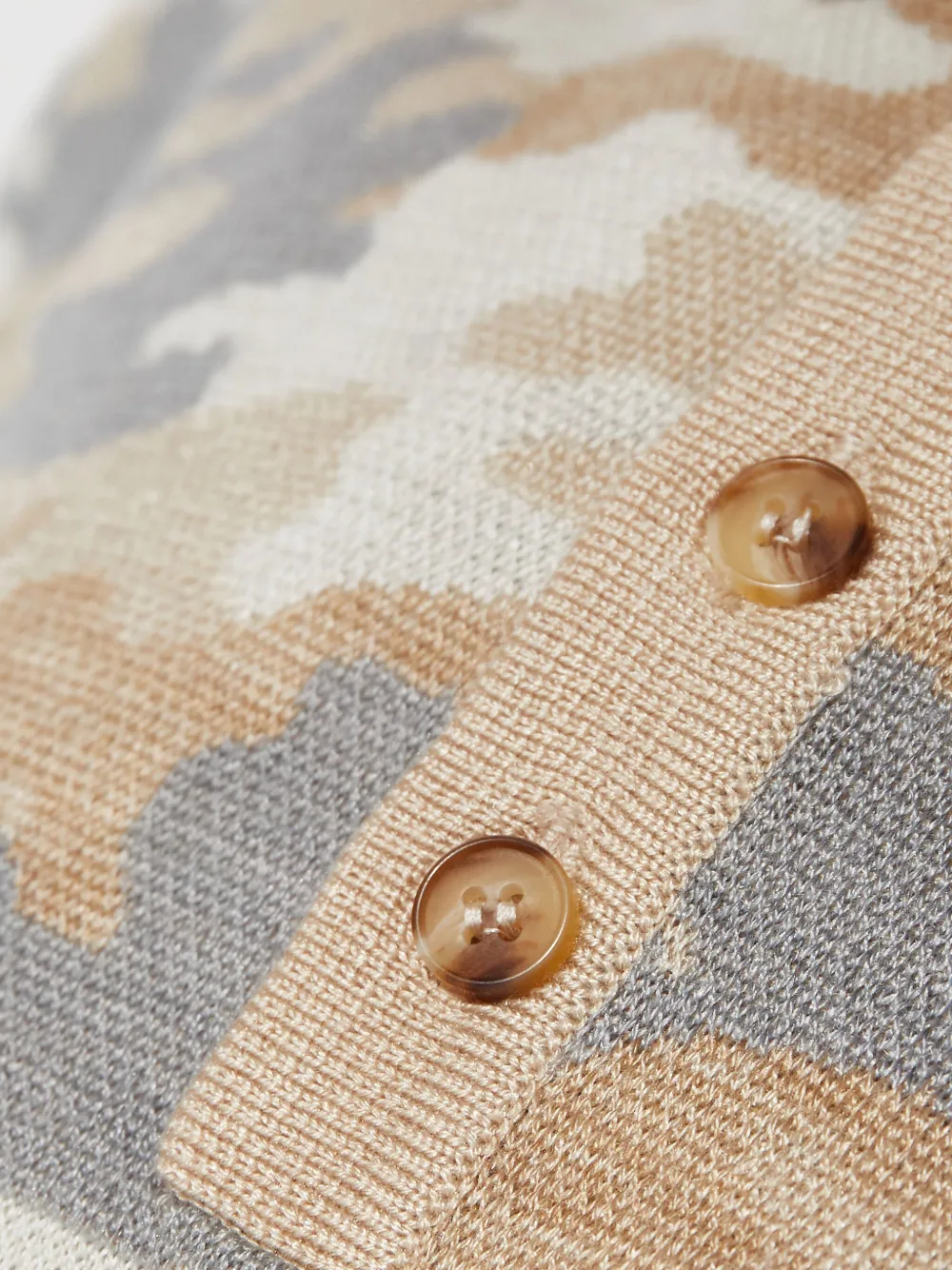 зелёный и многоцветный камуфляжный принт, воротник на пуговицах, короткие рукава, планка на три пуговицы, ворсистый (вязаный) воротник