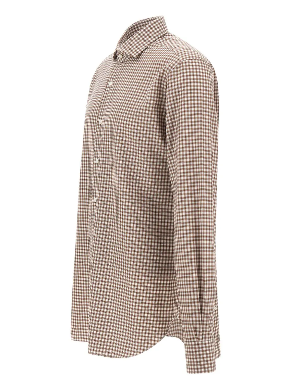 коричневая рубашка в клетку с классическим воротником, длинными рукавами, застежкой на пуговицы из перламутра и пуговицами на манжетах для двойного использования