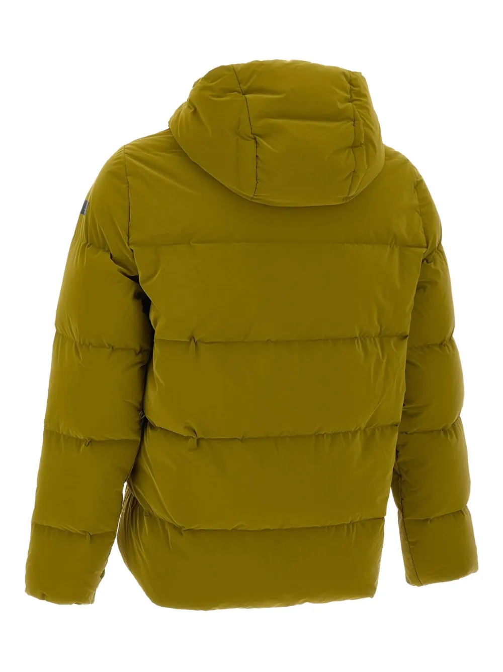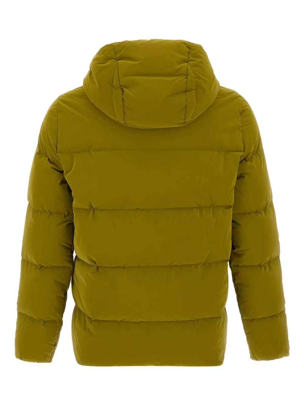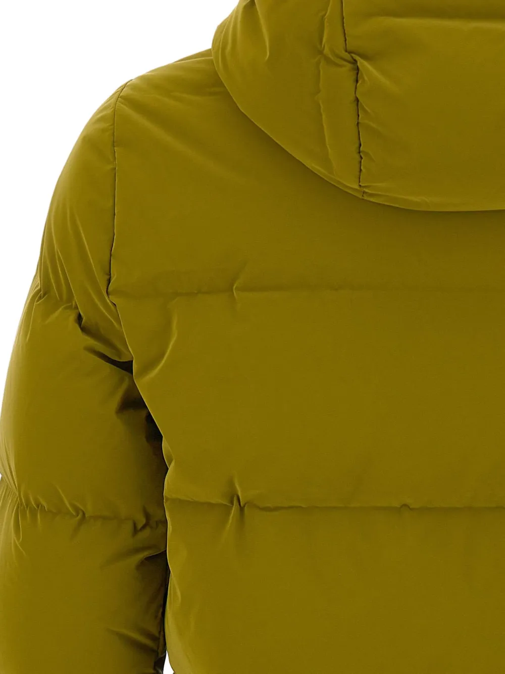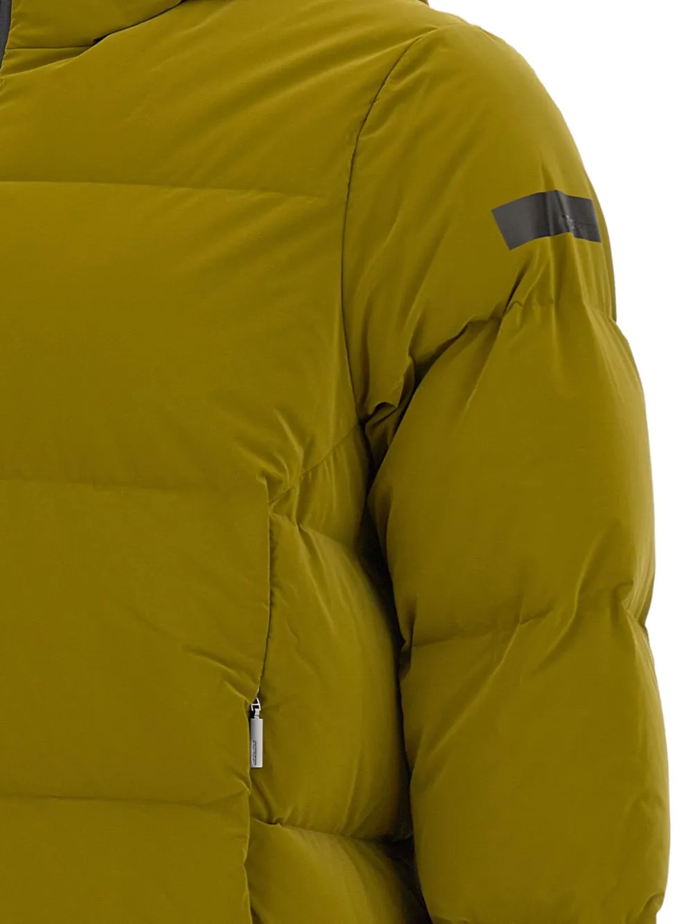 оливково-зелёный цвет, горизонтальная стёжка, несъёмный капюшон, застёжка-молния спереди, боковые карманы на молнии, нашивка с логотипом на рукаве