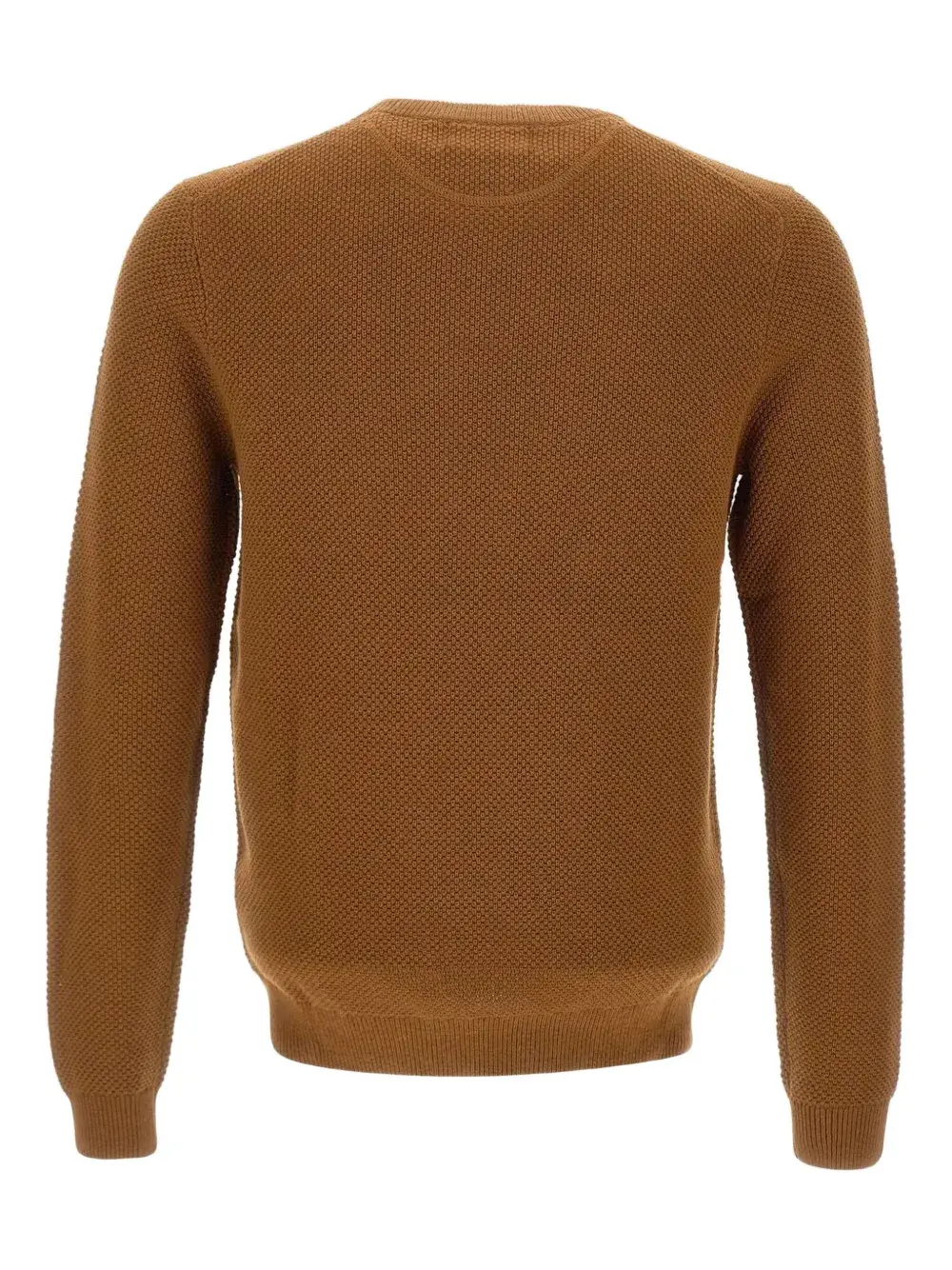 коричневый свитер с вышитым логотипом, круглым вырезом, длинными рукавами и ребристыми краями