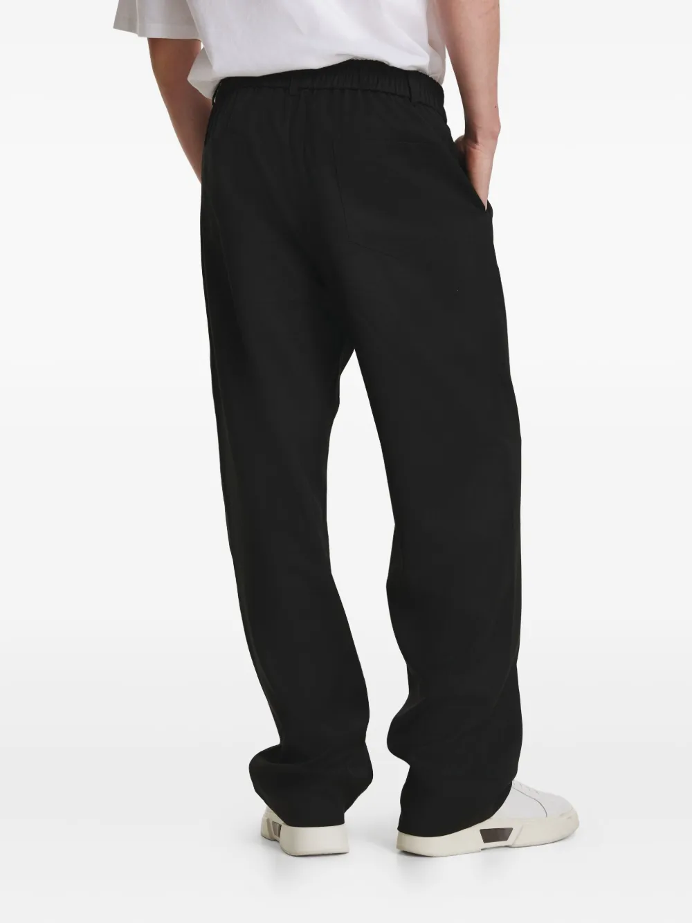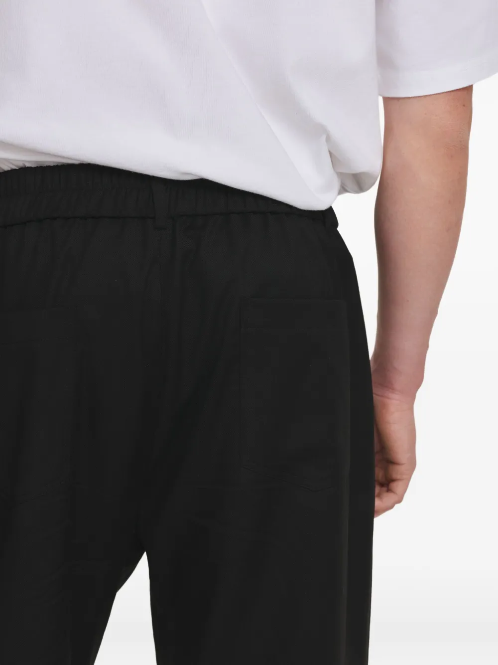 черный эластичный пояс, накладные задние карманы, застежка на пуговицы, шлевки для ремня